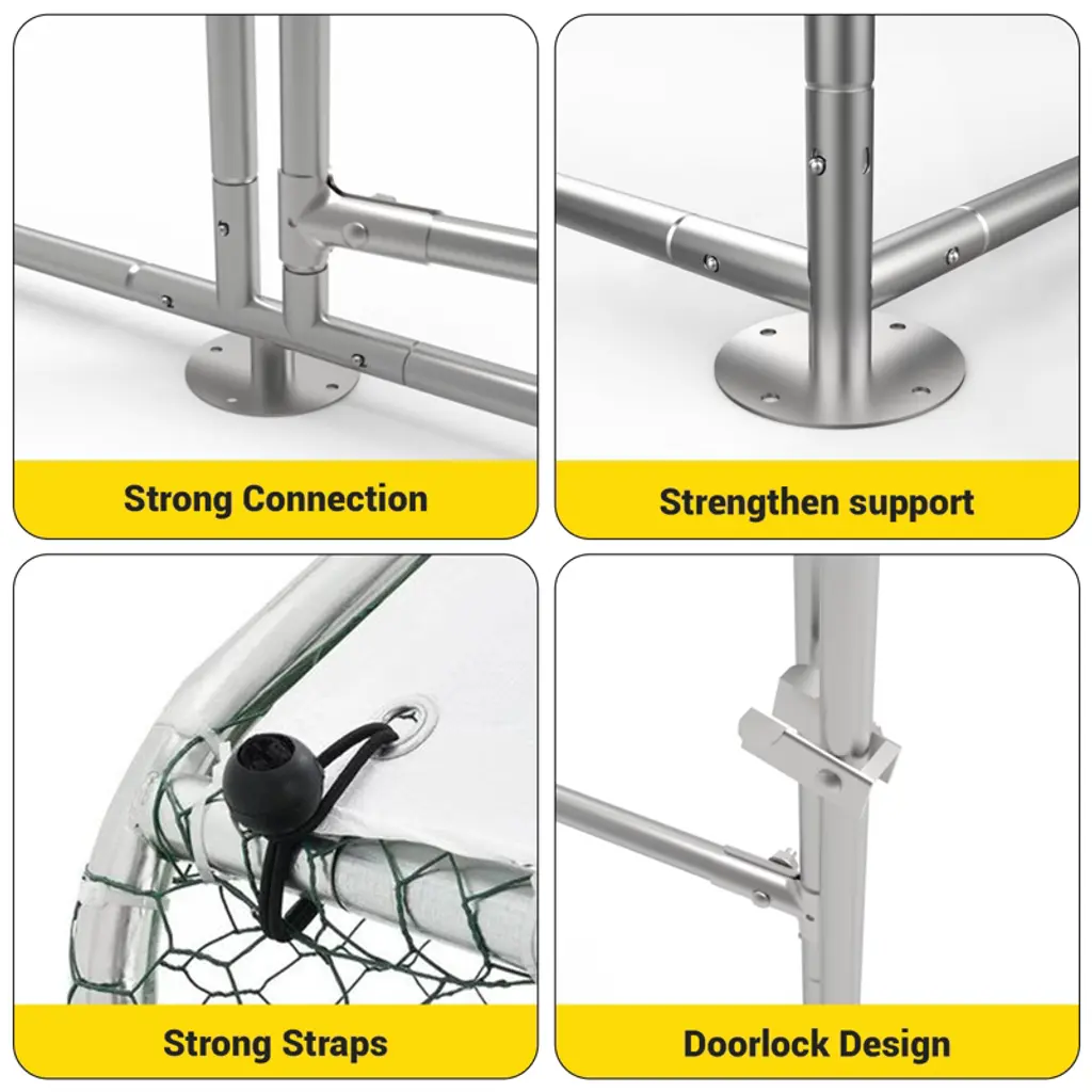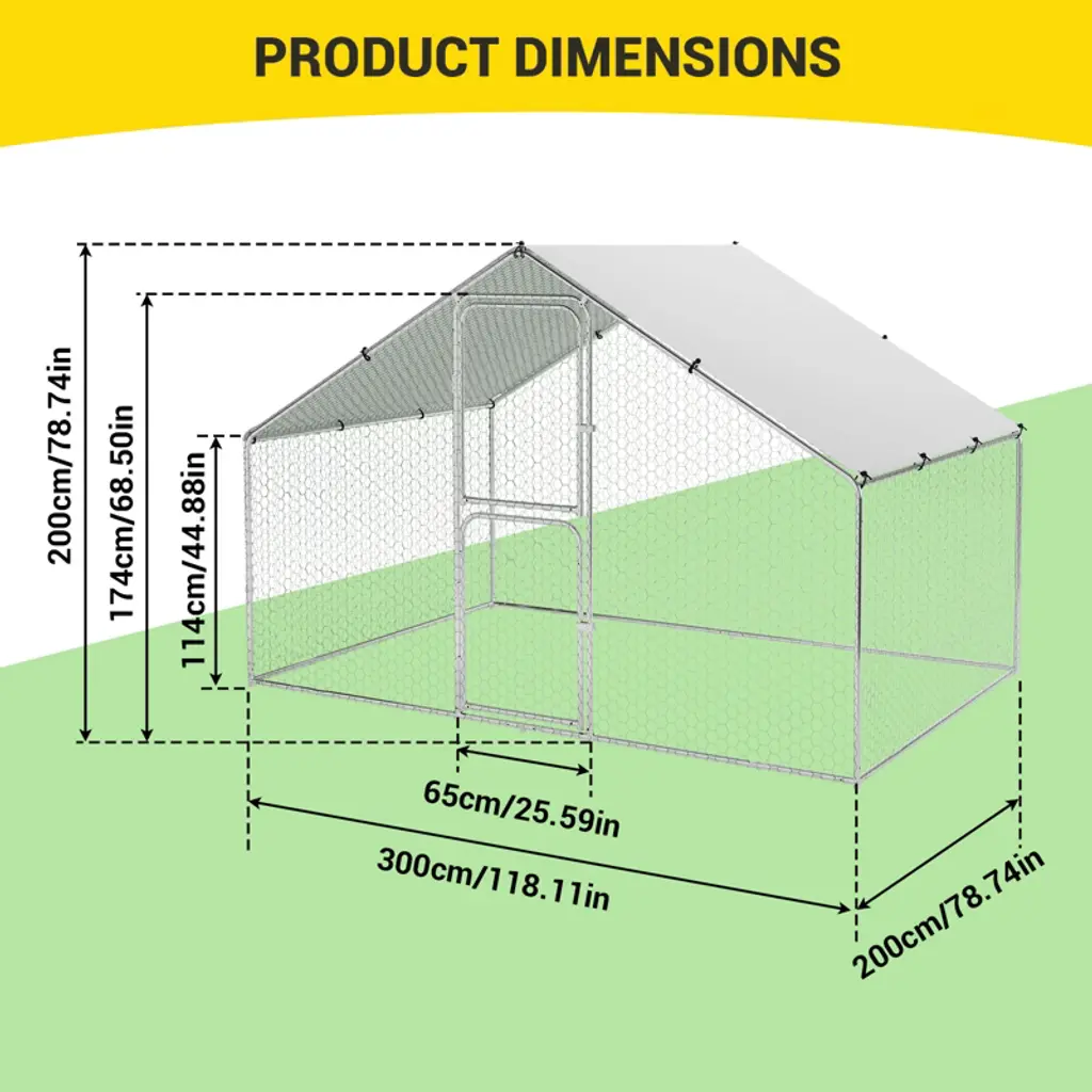 Premium Heavy-Duty Metal Chicken CoopGalvanized Steel Construction | Weatherproof Design | Multi-Species Habitat Key Specifications: Material: Rustproof galvanized steel pipes + PVC-coated wire meshDimensions (LxWxH):• Compact: 9.8 x 6.5 x 6.5 FT• Standard: 9.8 x 13.1 x 6.5 FT• Large: 9.8 x 19.7 x 6.5 FTPacking List: Metal coop frame, weatherproof cover, assembly kit, instruction manualUnbeatable Durability:Industrial-grade galvanized steel resists corrosion, predators, and extreme weather.Reinforced PVC-coated mesh prevents wear and extends lifespan.All-weather waterproof cover with UV protection + reinforced seams for storm safety. Animal-First Design:Spacious interior reduces stress and promotes healthy poultry.Adapts seamlessly to chickens, ducks, rabbits, or small animals.Lightweight yet unyielding frame for reliable security. Farmer Advantages:Effortless cleaning and modular accessory customization.Scalable for growing flocks (multiple size options).Note: Requires assembly on a flat, stable surface (uneven/soft ground not recommended). Protect Your Flock Year-Round:Where resilience meets animal welfare—engineered for gardens, farms, and homesteads.