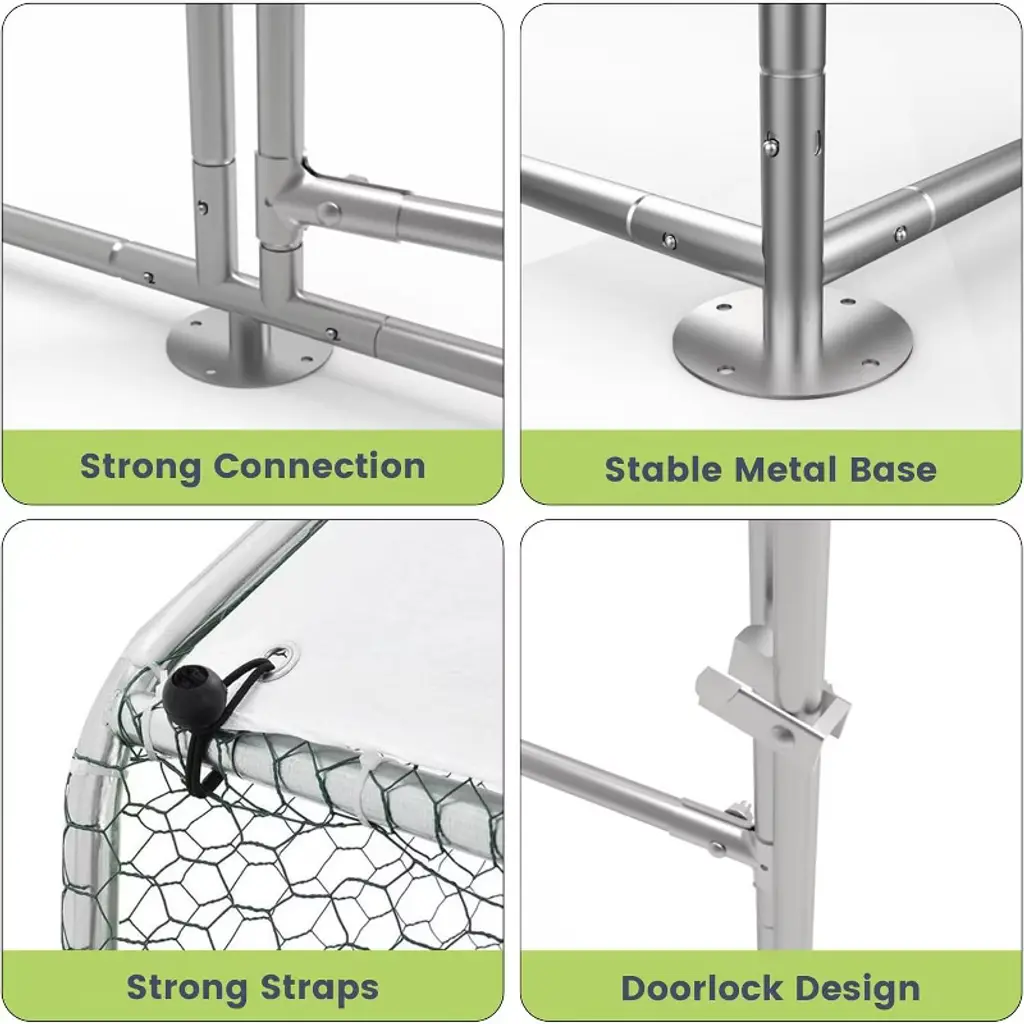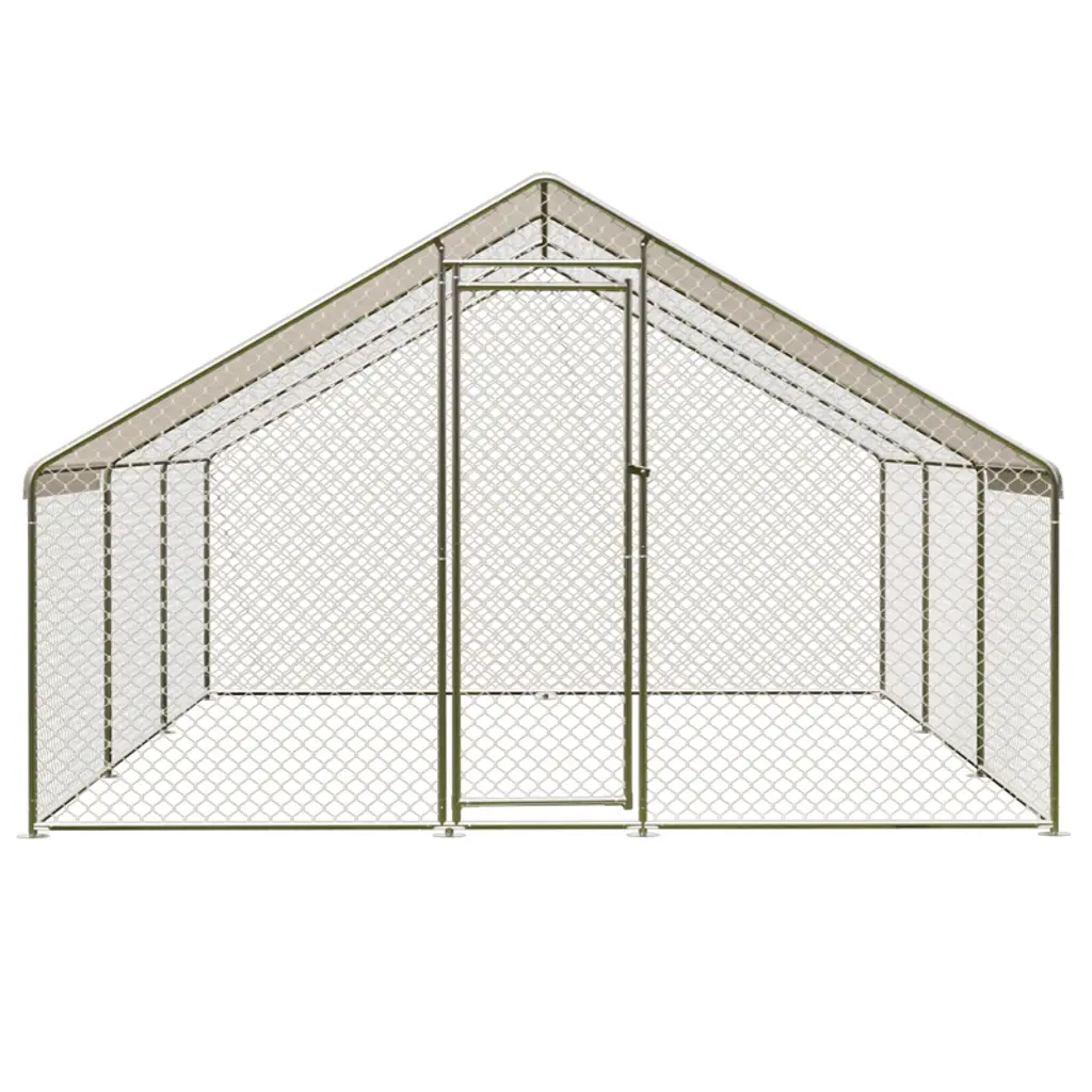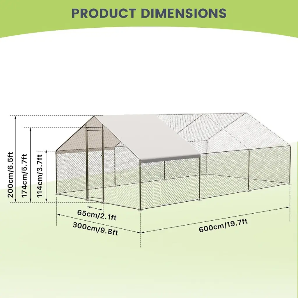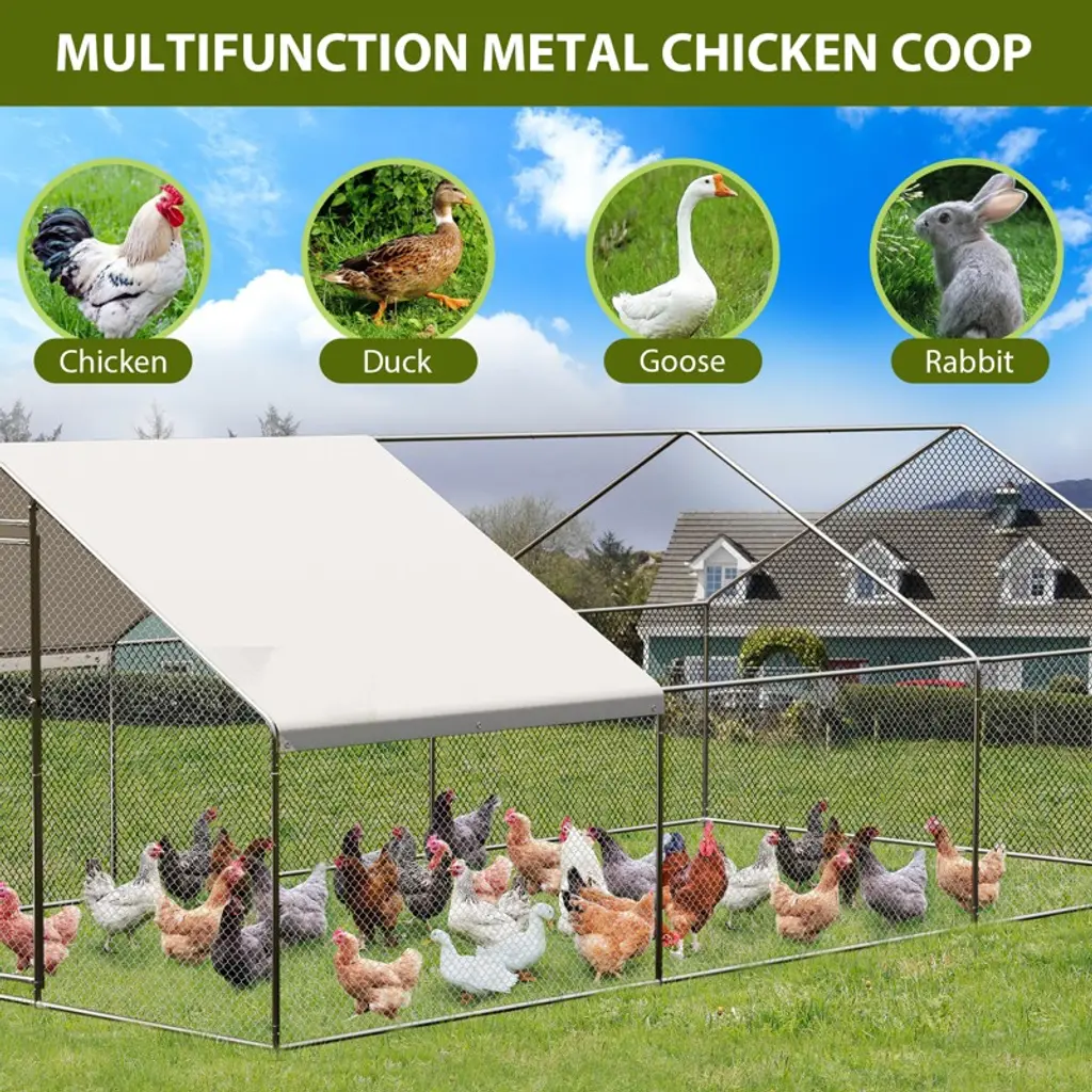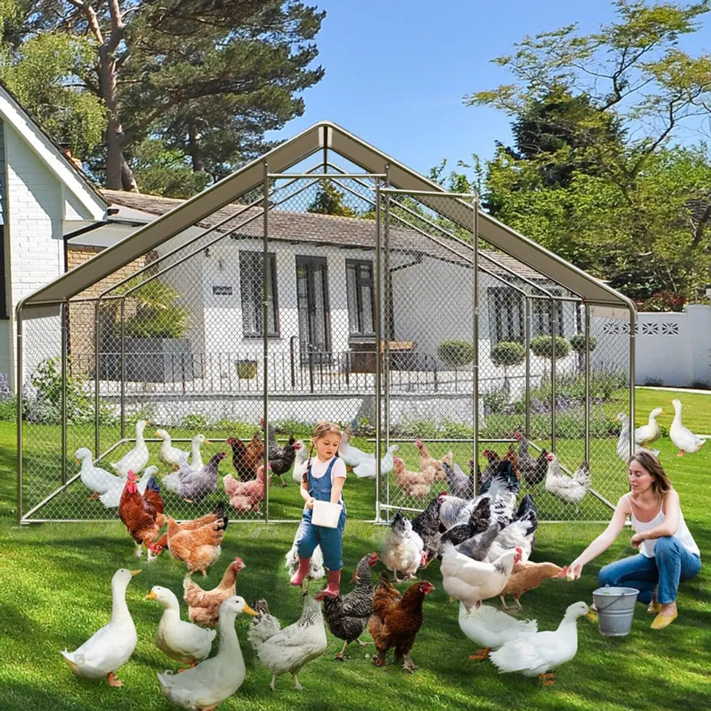 Premium Poultry Housing SolutionHeavy-Duty EngineeringCrafted with galvanized steel pipes and PVC-coated wire mesh, this coop resists rust, corrosion, and wear. Built to outlast harsh conditions, it combines industrial strength with a lightweight yet unyielding framework—perfect for safeguarding your flock year after year.Includes a weatherproof cover to shield against rain, wind, and UV rays. Reinforced seams divert water away, ensuring a dry interior during storms and shade in summer heat.Multi-Purpose HabitatAdaptable for chickens, ducks, rabbits, or small livestock. Whether in backyard gardens, farms, or homesteads, this coop blends seamlessly into diverse environments.Unmatched Durability: Galvanized steel and PVC-coated mesh withstand predators, moisture, and wear.Animal-Centric Design: Spacious layout reduces stress, promoting healthier, happier poultry.Storm-Ready Protection: Waterproof cover + rustproof materials = peace of mind in any climate.Farmer-Friendly Features: Clean with ease, rearrange accessories, and adapt to growing flocks.