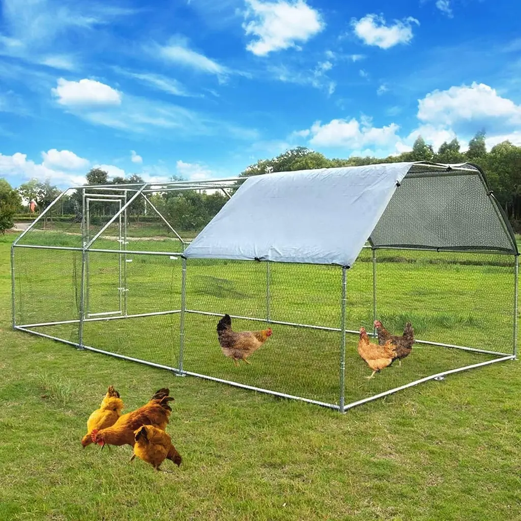 Weatherproof Protection:Our hen house features a robust polyethylene tarp covering the top, shielding the steel frame from harsh weather elements like sun, rain, snow, and preventing rust or corrosion. This means long-lasting protection and peace of mind for both you and your poultry. Enhanced Security with Lockable Design:Designed with safety in mind, this coop includes a lockable chicken run that makes feeding and cleaning a breeze. The walk-in chicken pen is covered with a durable, wear-resistant oxford material roof, offering comprehensive protection from sun, rain, and snow. Your poultry will enjoy a secure and comfortable home.