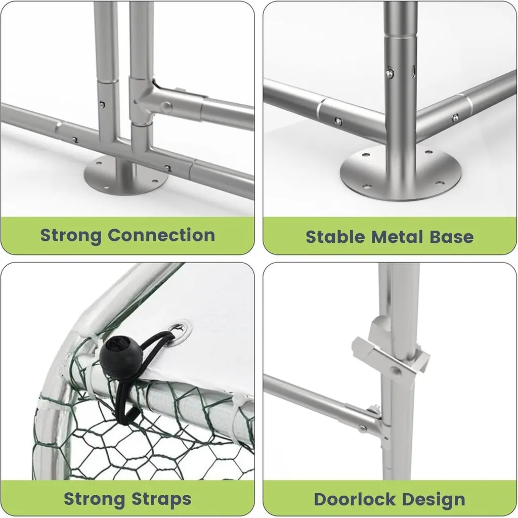 Sturdy & Durable Construction: Crafted from high-quality metal materials, this chicken coop is designed to be sturdy and durable, minimizing the risk of quality issues and ensuring it can withstand the test of time without easily sustaining damage. Waterproof & UV Protection Cover: The waterproof cover is tailored to fit the cage perfectly, providing comprehensive protection from sun exposure, rain, and snow. Its sloped roof design allows water, debris, and light snow to run off easily, preventing accumulation that could compromise the structure. Convenient & Safety Lockable Door: Designed for ease of access, this chicken run features a firm gate with a reinforced door and lock function. The narrowed gaps help prevent chickens from escaping and deter wild animals from entering. The lockable steel door includes a hasp and steel wire ties for added security. Easy Installation: Each connection point of the poultry cage has been optimized to simplify installation. While the assembly process may include challenging steps, the high-quality connecting parts provided make the installation quicker and more efficient, saving you time and energy. Well-Ventilated Design: The coop is designed to ensure sufficient internal air circulation, promoting healthy respiration for your animals. This ventilation helps maintain a healthy living environment, allowing you to use the coop with confidence while ensuring your pets enjoy the same high-quality air as the outside environment.