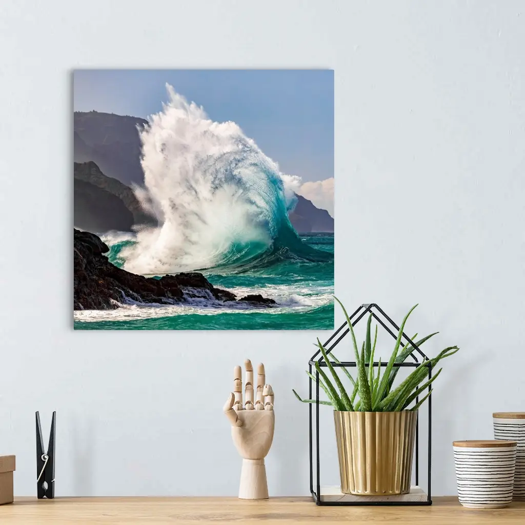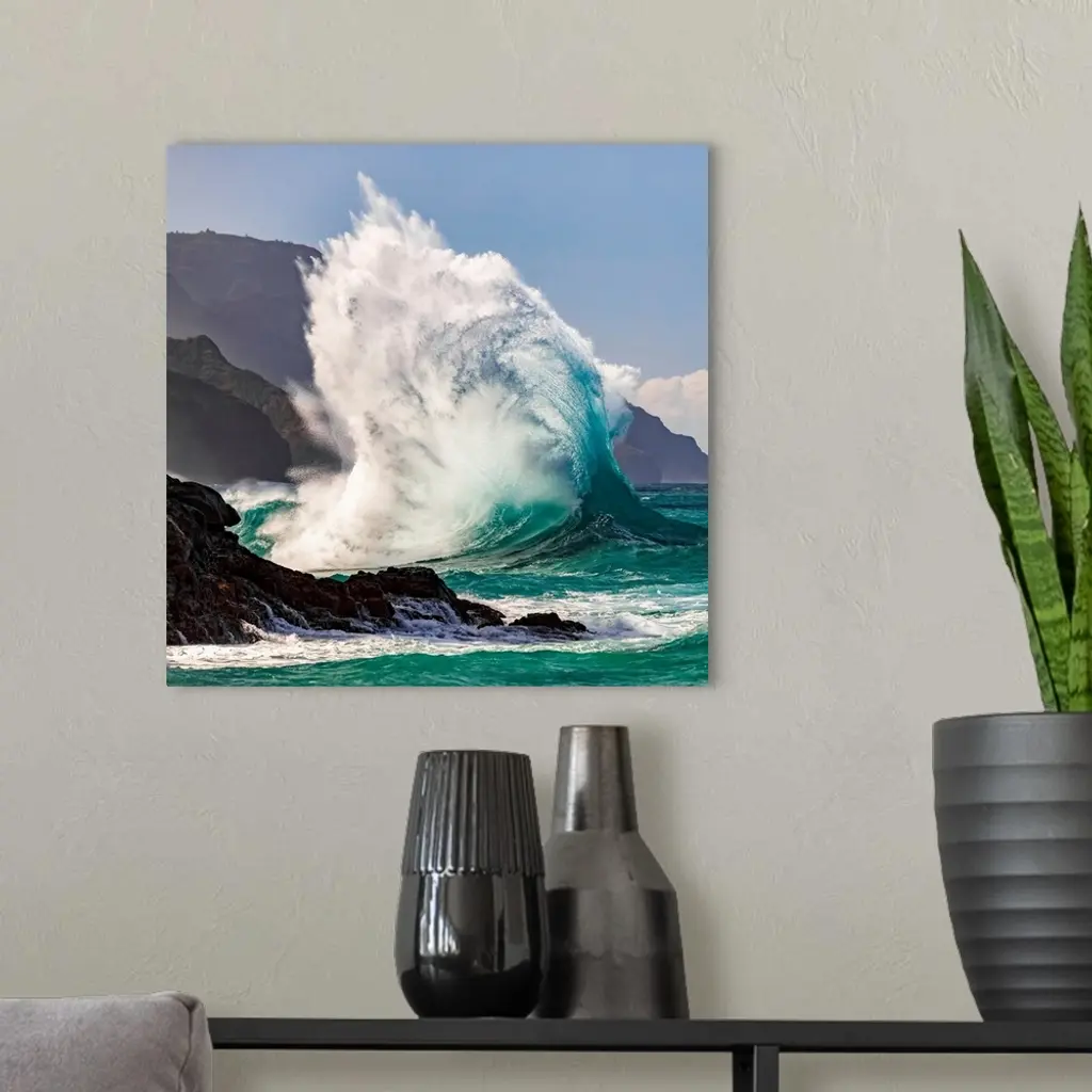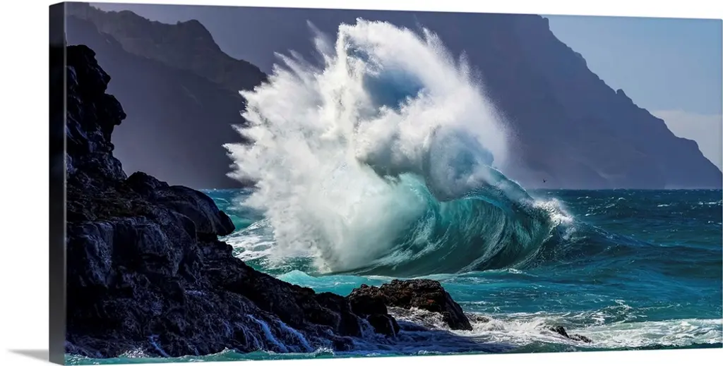 Large ocean wave crashes into rock along the Na Pali coast, Kauai, Hawaii, united states of America.