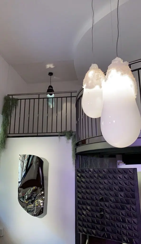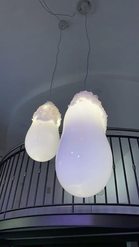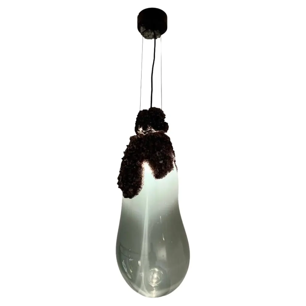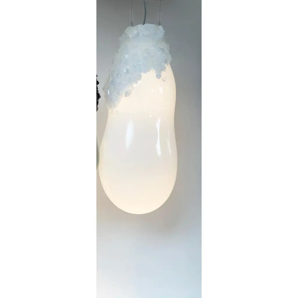 Large overgrown bubbles by Mark Sturkenboom and Alex de WitteDimensions: D 30 x H 76 cm Material: Mouthblown glass, natural grown crystal, dimmable led, colour white or grey blackCeiling ornaments can be produced in crystal to extend the overgrown installation.Exact precise dimensions are not guaranteed, width is always different but generally can only reach 25-40% of the height. Please contact us.For this collection Sturkenboom worked closely together with the glass blowers and glass cutting artisans from the GlassFactory in Boda, Sweden.Mark Sturkenboom (Driebergen, 1983) is an artist that graduated with honors in 2012 at Artez Academy for the Arts in Arnhem/Netherlands. Since 2012 he works as a conceptual product designer/artist in his atelier in Utrecht.His work balances between art and design, he stretches the boundaries between art and design. He offers new viewpoints and rituals to deal with life.‘My focus lies not on the appearance of things, but on what I call the deeper layers in the relation between an object and its owner. ‘I try to call forward a myriad of associations and stimulate our thinking about what counts to us in our lives.I examine the meaning of objects and products and set them free from their conventional and initial use.’Sturkenboom reinterpretates products that are often intertwined with the themes love, time or has an inclination with a collective value perception.Engaging his work, you probably will need to start making ‘moral’ decisions. For instance his Ark, table clock, urn or vase are not just functional or only good looking.In their presence and while handling them they invite you to think about time, love passed or the possibility to free yourself from the burden of your possessions by destroying them.His work is exhibited and part of private collections worldwide, from New York to Shanghai, from Tokio to Amsterdam.