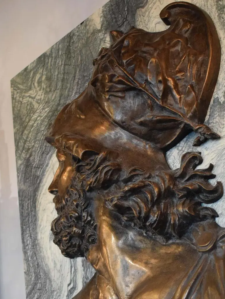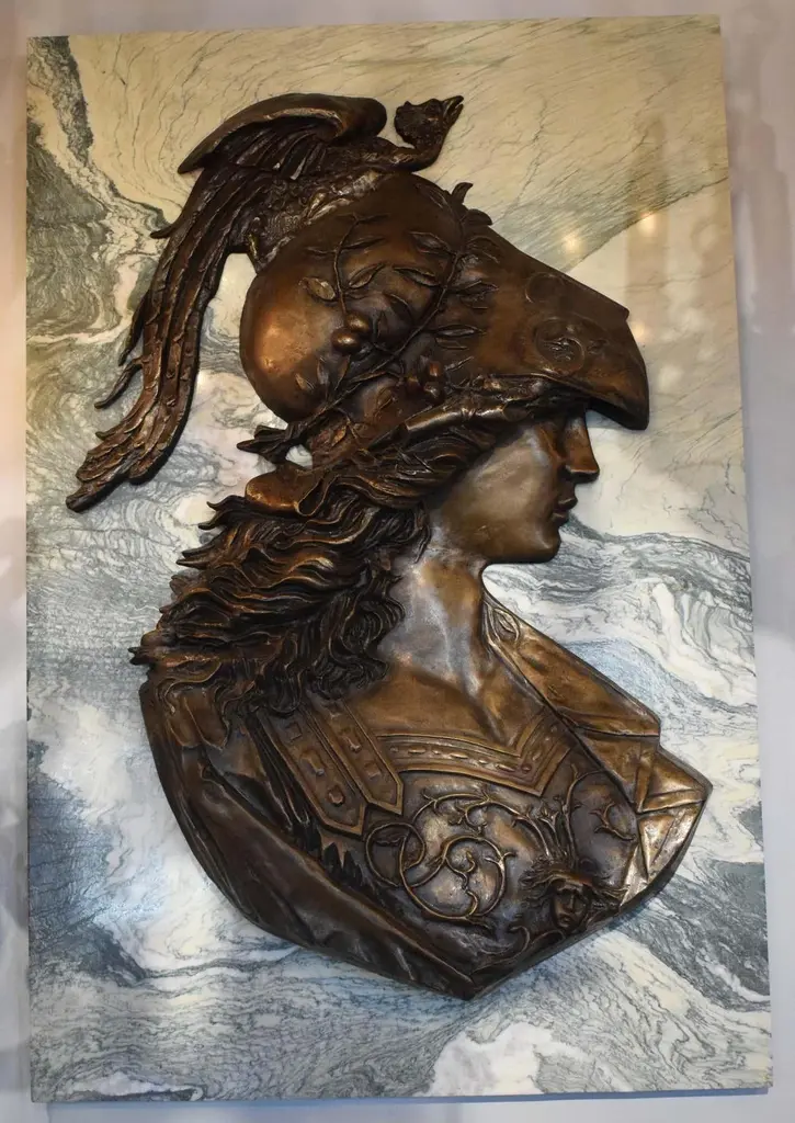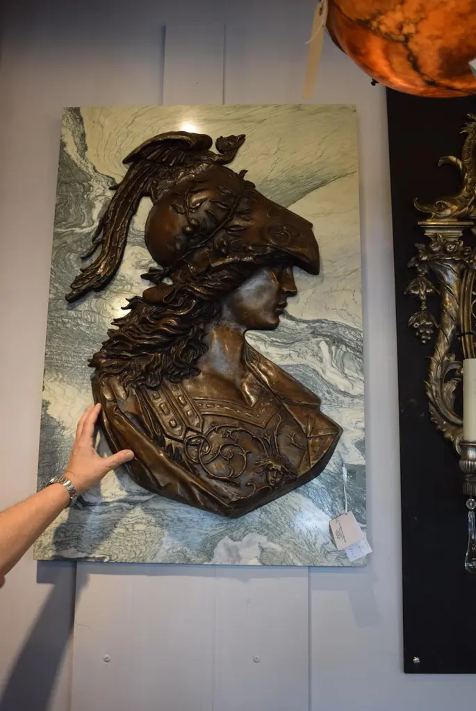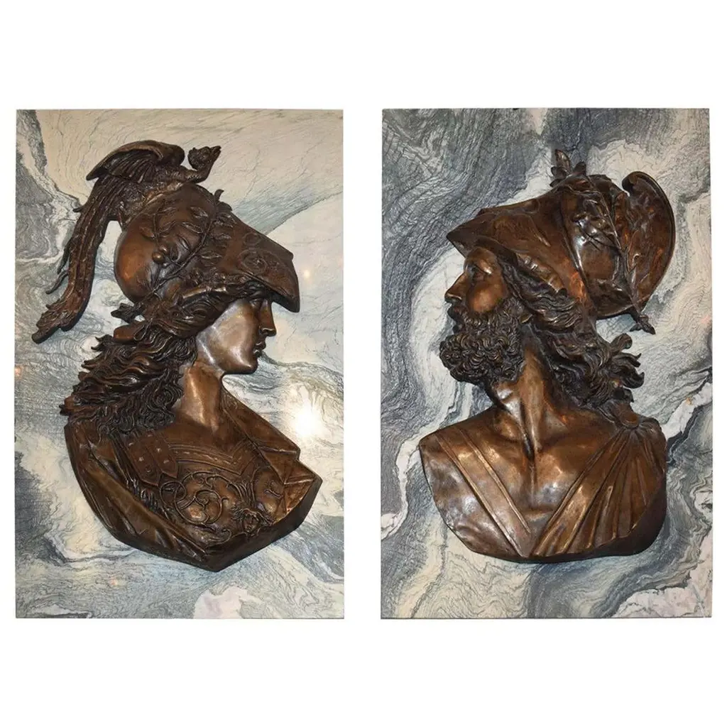 Large pair of Emile Pinedo of portrait medallions on marble plaquesEmile Pinedo 1840-1916 "MINERVA and MARS," A large pair of portrait medallions on marble plaquesParis, France - late 19th centuryMeasures: Marble height: 39" width:26" thickness: 3/4"Minerva: Height 32" width 22"Mars: Height 31" width: 19 1/2"CW4077.