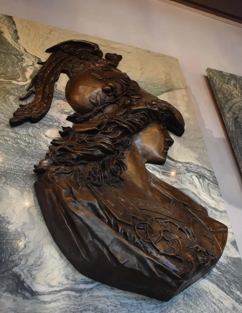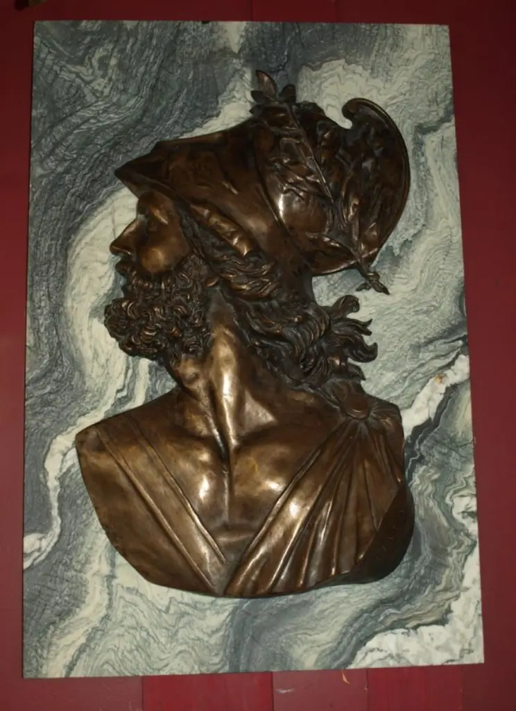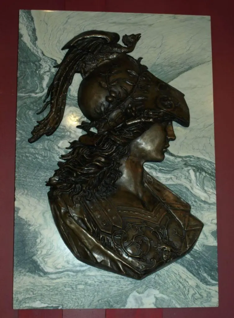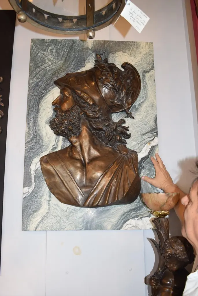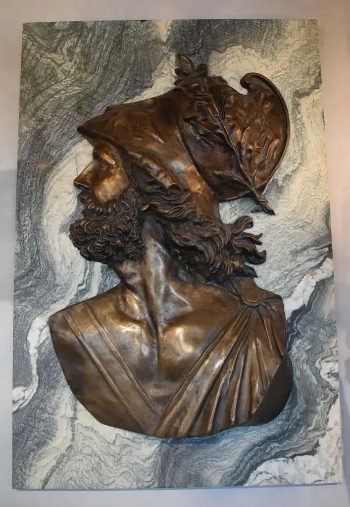 Large pair of Emile Pinedo of portrait medallions on marble plaquesEmile Pinedo 1840-1916 "MINERVA and MARS," A large pair of portrait medallions on marble plaquesParis, France - late 19th centuryMeasures: Marble height: 39" width:26" thickness: 3/4"Minerva: Height 32" width 22"Mars: Height 31" width: 19 1/2"CW4077.