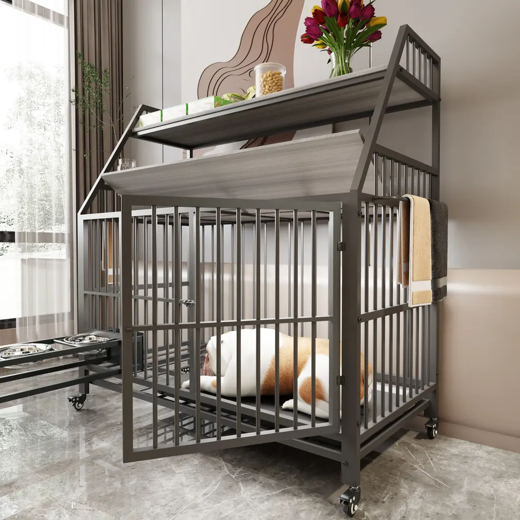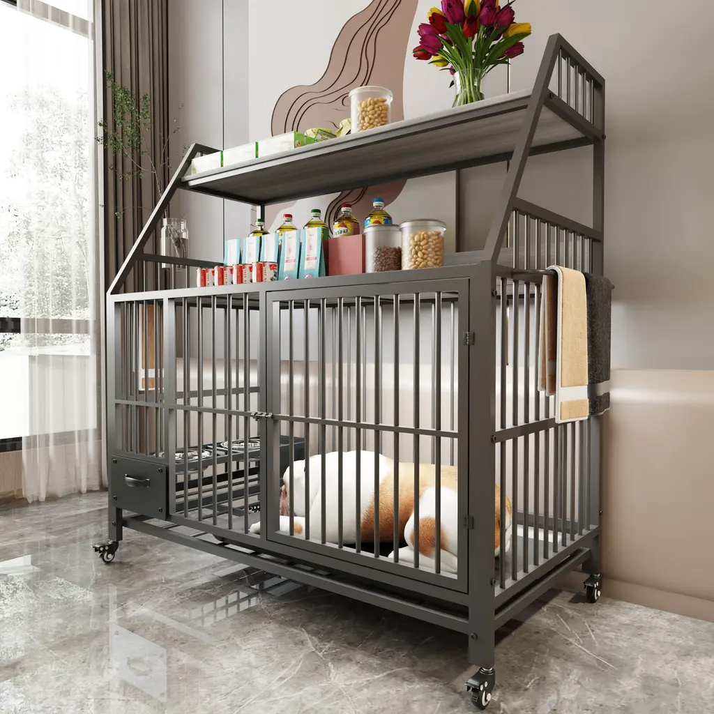 Large Pet Cage With Storage Rack, Drawers With Food And Water Basins, Double-Layer Storage Rack, Iron Frame And Mdf Material - Black+gray