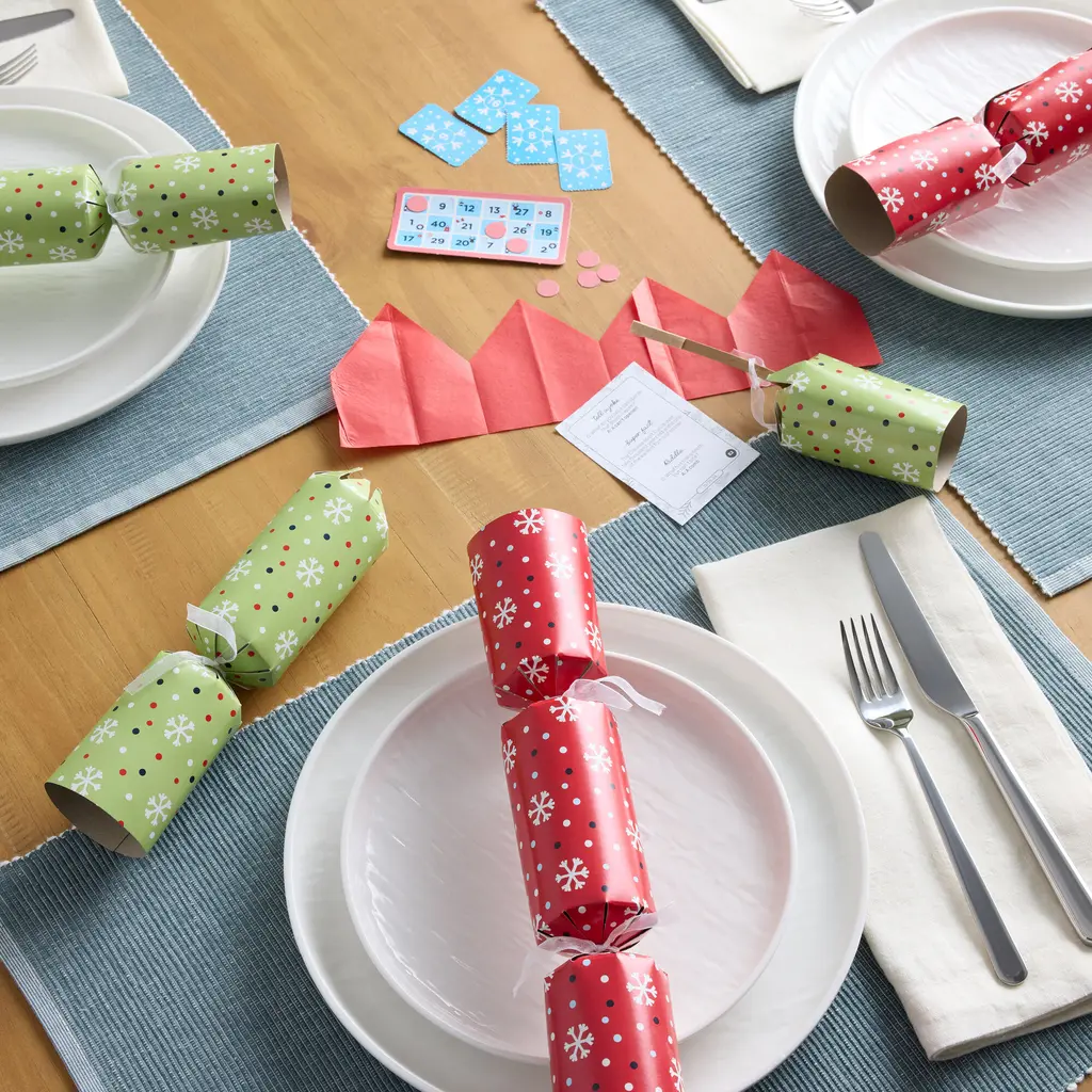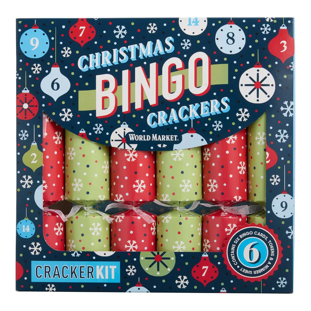 A British tradition comes to life with World Market Christmas crackers, featuring festive new designs every holiday season. Handcrafted by artisans in South Africa from red and green paper adorned with cheerful snowflakes and tied with iridescent ribbon, each cracker snaps open to reveal a joke and a paper crown. The box also contains everything you need for a holiday game of bingo: six bingo cards, number cards, and tokens for everyone.