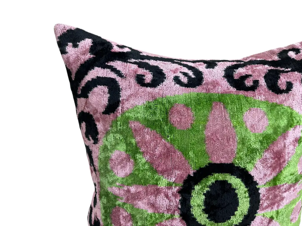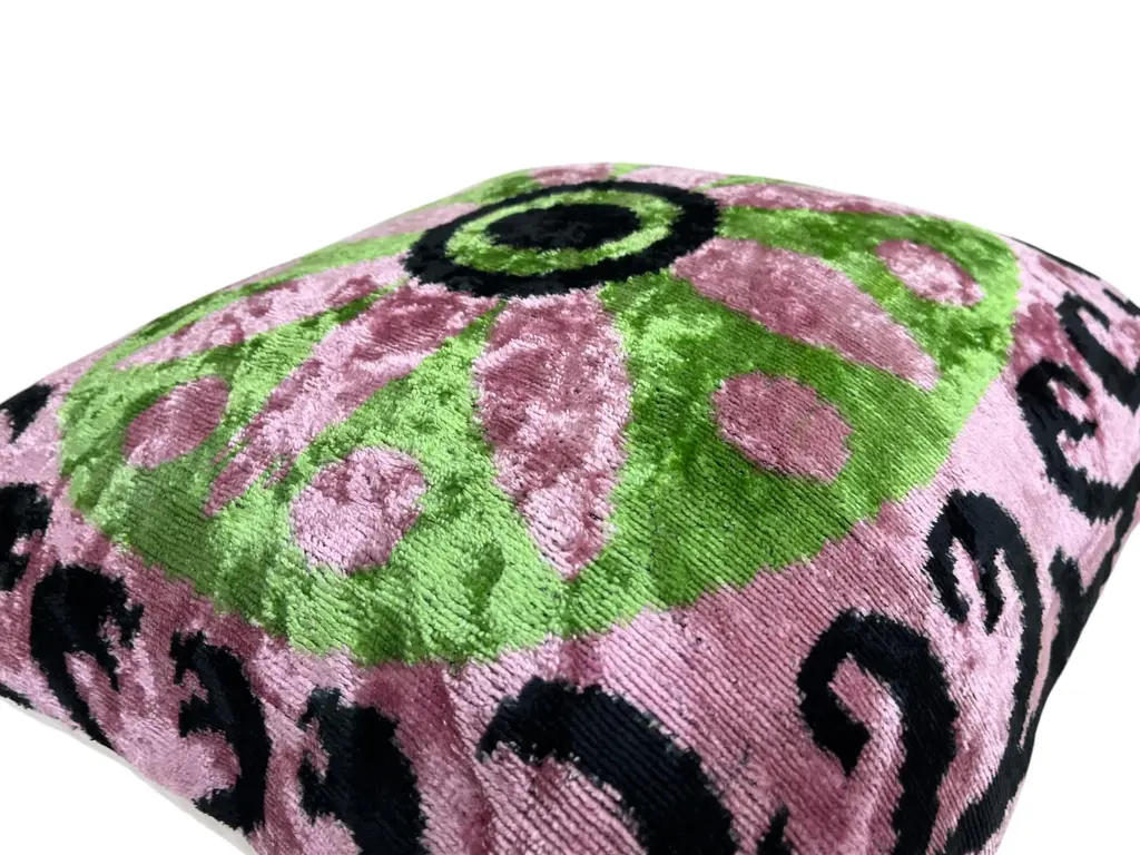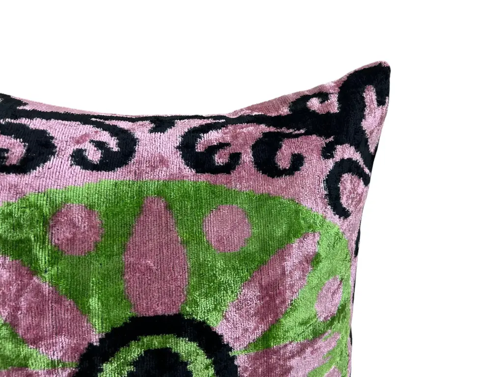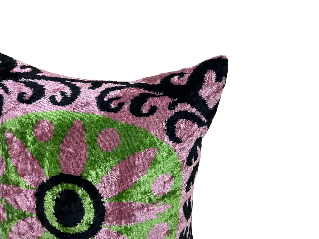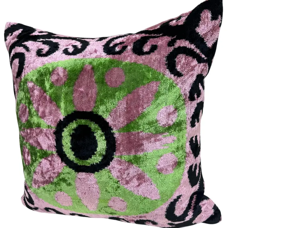 Handmade Velvet Silk IKAT cushion cover with green evil eye design and multicolor. It can be a perfect gift for new house. This pillow case features a luxurious silk velvet fabric with an ikat pattern, adding a touch of elegance and sophistication to any space. The unique weaving technique of ikat creates a striking, artistic design, while the softness of the silk velvet ensures both comfort and visual appeal. Perfect for accenting your living room, bedroom, or any area in need of a stylish, refined statement piece. Size: 20" 20" Inc - (50x50 cm) Care: Dry Cleaning Cushion insert is not included