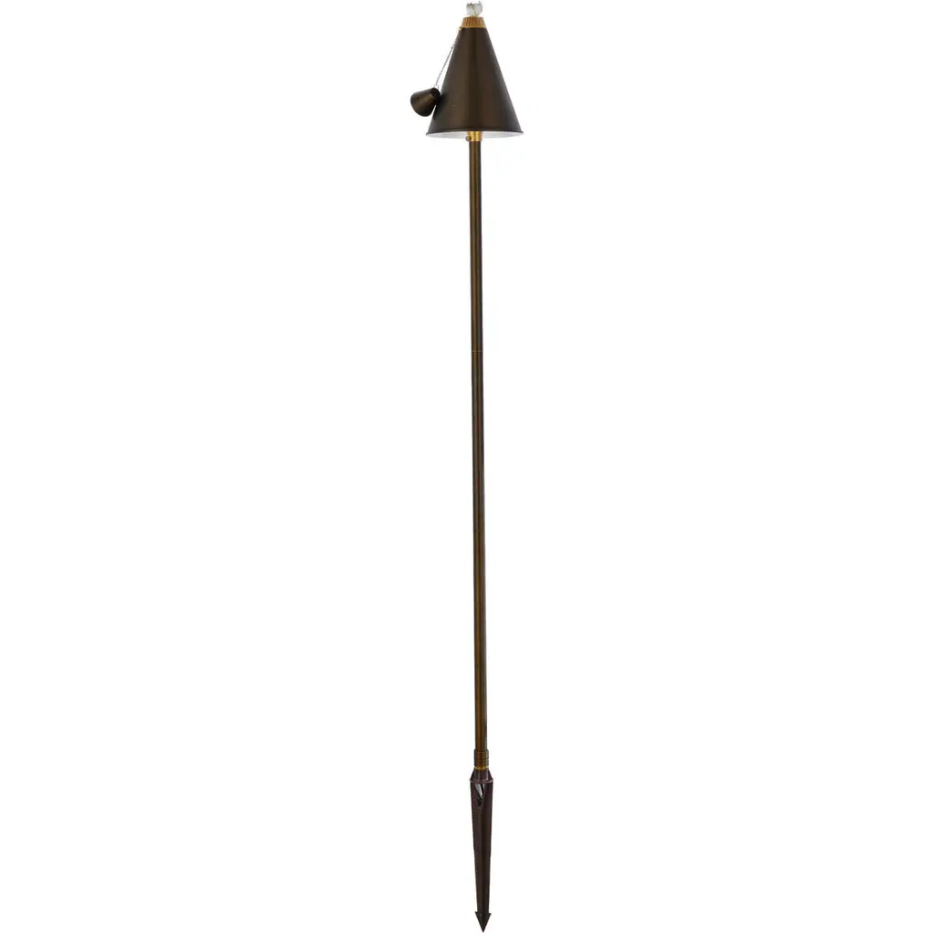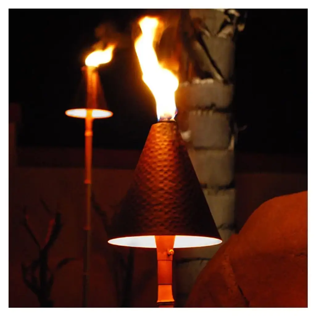 A festive, tropical addition to your outdoor walkways and patio areas. The Focus Industries Large Tiki Torch and Light mounts to your deck with an angle cut stanchion and uses the pleasant, hypnotic brilliance of an oil-based flame and a hidden downlight to illuminate the surrounding area. The included 68 inch stem (made of galvanized steel) is available in several different sleeve finishes and is topped with a head of hand-spun copper, a long lasting fiberglass wick, and a snuff cap. The fuel container is concealed within the cone-shaped head and is easily filled/refilled with liquid torch fuel commonly available at home improvement stores. Electrical lighting connects to a 12v landscaping system. Transformer is necessary but not included. Optional canopy available separately.