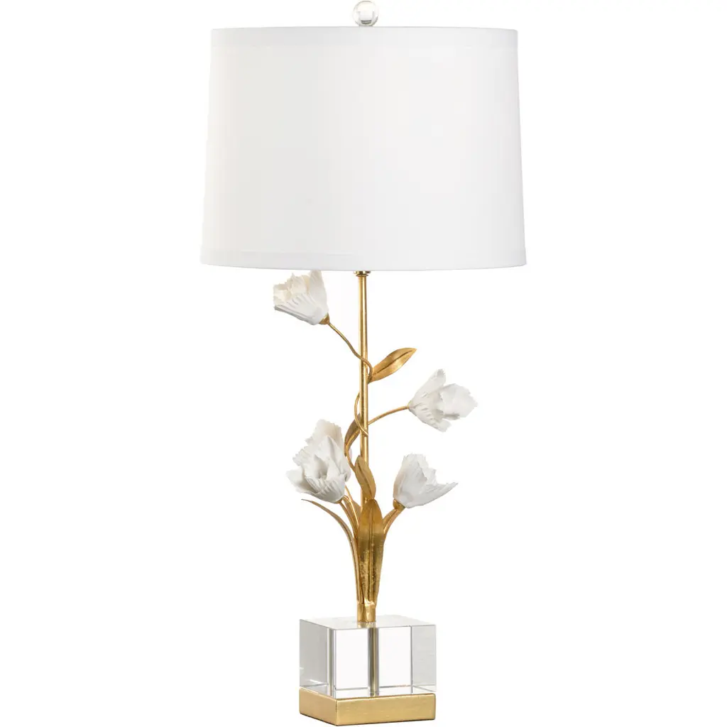 Hand Formed Whtie Porcelain Tulips On Gold Leaf Iron Stem With Iron And Crystal Mount.