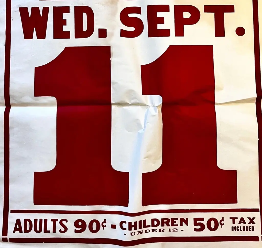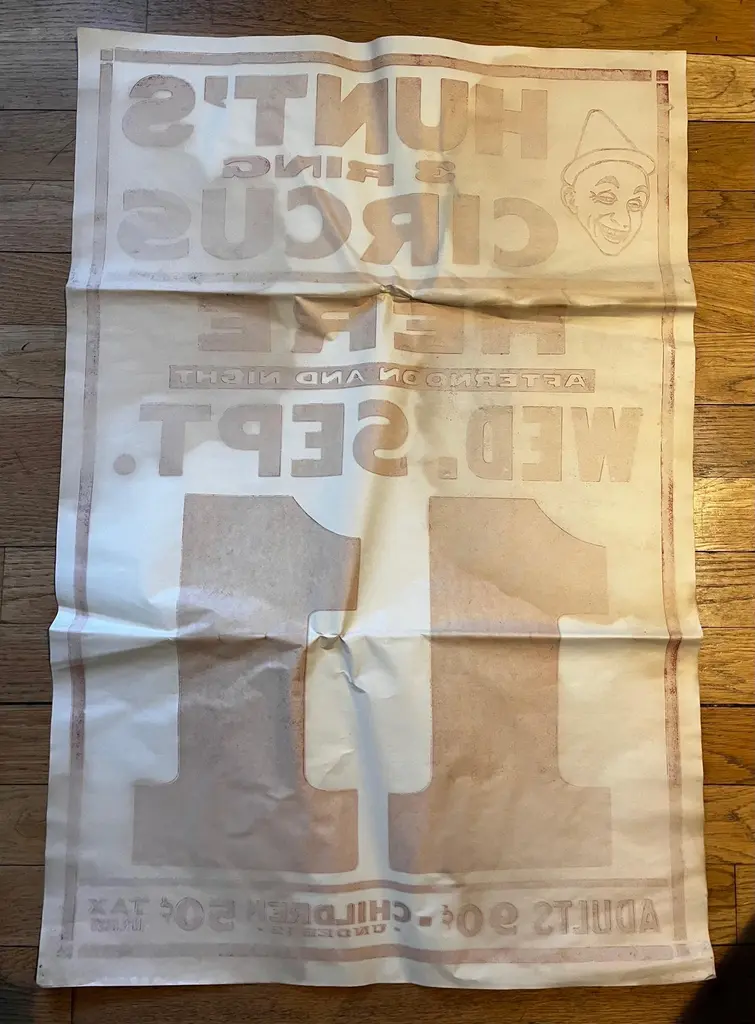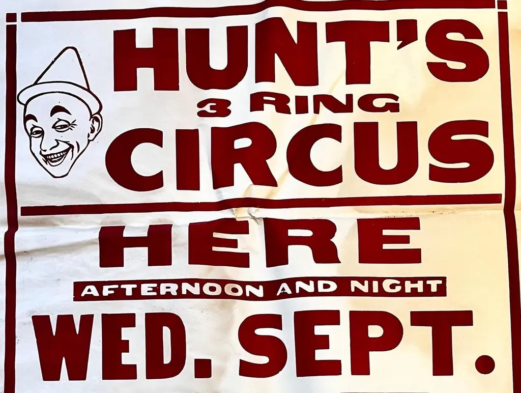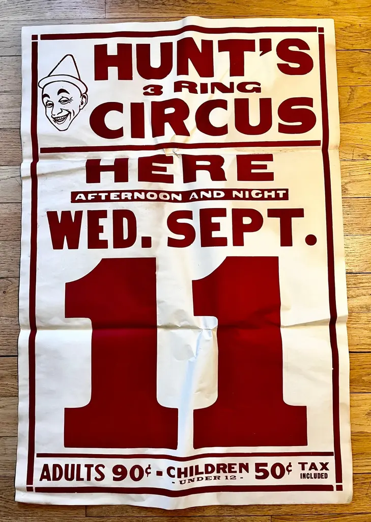 Hunt's Three Ring Circus Date Poster 28" x 41 5/8"September 11th, circa 1920's"poster / circus is from the northeast""large original circus date poster""in very good vintage as found condition" - "some, wrinkles, fold and discoloration""this item will look amazing once properly framed""an original poster ("before") in the style of contemporary pop artists who use type face as artie: Roy Lichtenstein, Andy Warhal, Christopher Wool, etc."