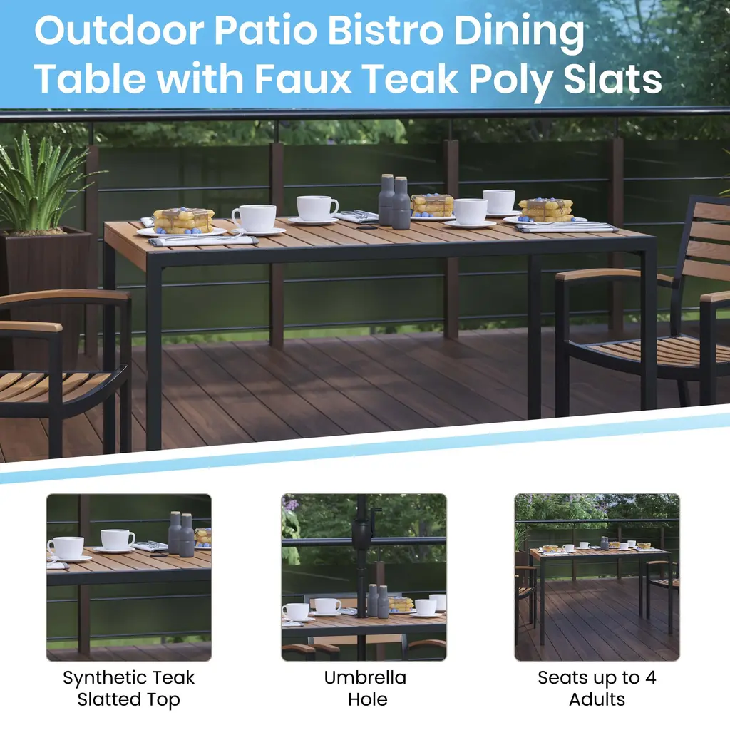 Provide shaded dining space at your home or business with this 3 piece table, umbrella, and weatherproof base set. Patrons love to dine al fresco and this all-weather dining set won't disappoint. The trending synthetic slats contrast beautifully with the metal frame and blend seamlessly in almost any decor. The included umbrella will protect your electronics and pets from overheating. Entertain guests at your home or restaurant with this on-trend outdoor seating set. The 18 gauge steel frame of the patio table features metal screw construction that holds up to 300 Lbs. static weight capacity to effortlessly hold your favorite dishes while the patio umbrella boasts push button tilt to keep you shaded no matter where the sun is. Powder coating on the dining table and 1.5 inch aluminum umbrella pole resists nicks and scratches and is weather-resistant for year-round use though care should be taken to protect from prolonged periods of wet weather. 8 solid steel ribs give this outdoor table umbrella a uniform shape that will hold up to light breezes and rain. The outdoor patio table assembles in 30 minutes or less with the included step-by-step instructions to refresh your outdoor dining space in your home or restaurant. For the umbrella, simply press down the lock button and attach the pole extension for quick setup in under 10 minutes. Your new outdoor dining table wipes clean with a damp cloth and the umbrella cleans with a water based cleaner. Fixed glides on the patio table will maintain the appearance of your hard flooring surfaces when being used indoors.