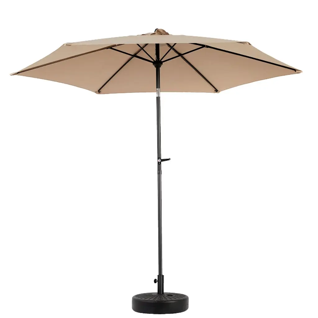Provide shaded dining space at your home or business with this 3 piece table, umbrella, and weatherproof base set. Patrons love to dine al fresco and this all-weather dining set won't disappoint. The trending synthetic slats contrast beautifully with the metal frame and blend seamlessly in almost any decor. The included umbrella will protect your electronics and pets from overheating. Entertain guests at your home or restaurant with this on-trend outdoor seating set. The 18 gauge steel frame of the patio table features metal screw construction that holds up to 300 Lbs. static weight capacity to effortlessly hold your favorite dishes while the patio umbrella boasts push button tilt to keep you shaded no matter where the sun is. Powder coating on the dining table and 1.5 inch aluminum umbrella pole resists nicks and scratches and is weather-resistant for year-round use though care should be taken to protect from prolonged periods of wet weather. 8 solid steel ribs give this outdoor table umbrella a uniform shape that will hold up to light breezes and rain. The outdoor patio table assembles in 30 minutes or less with the included step-by-step instructions to refresh your outdoor dining space in your home or restaurant. For the umbrella, simply press down the lock button and attach the pole extension for quick setup in under 10 minutes. Your new outdoor dining table wipes clean with a damp cloth and the umbrella cleans with a water based cleaner. Fixed glides on the patio table will maintain the appearance of your hard flooring surfaces when being used indoors.