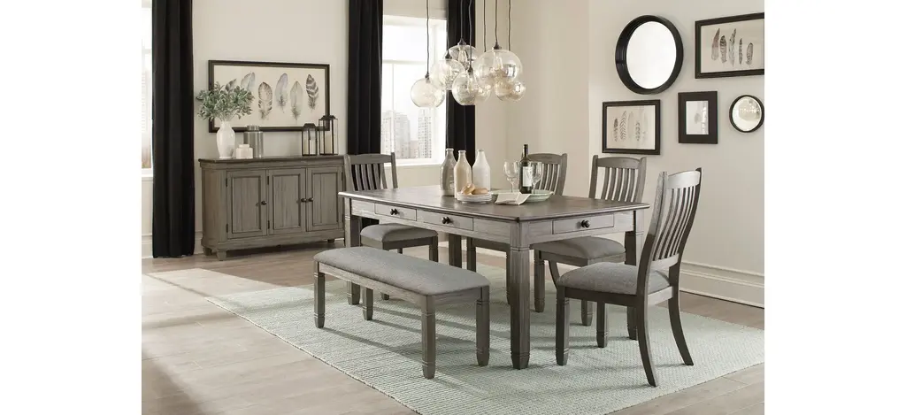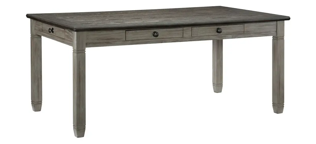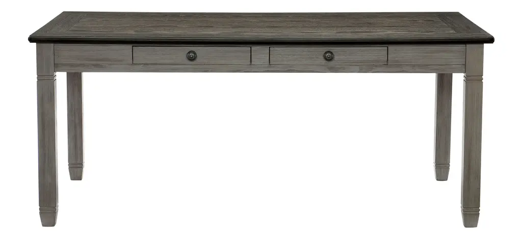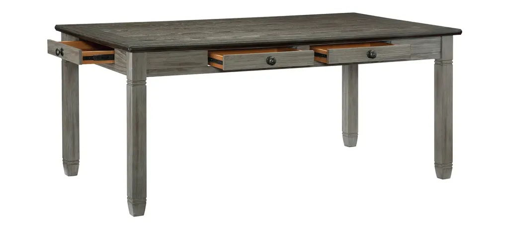 Inspired by the aesthetic of a casual country kitchen, the Lark set is an inviting gathering spot for mealtime with family and friends. The 72-inch dining table features 6 drawers on the apron. The two-tone look of the acacia and pine solids base, finished in antique gray, and the oak veneer of the coffee-finished tabletop, present as a harmonious combination of color, perfect for your home. The drawers on the table apron feature dark metal knob hardware.