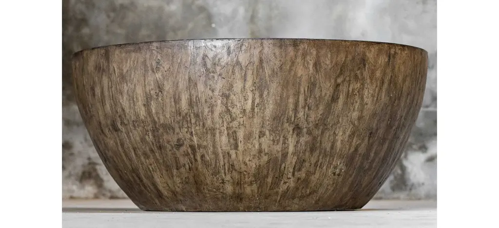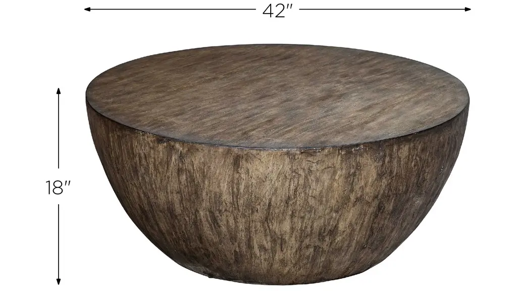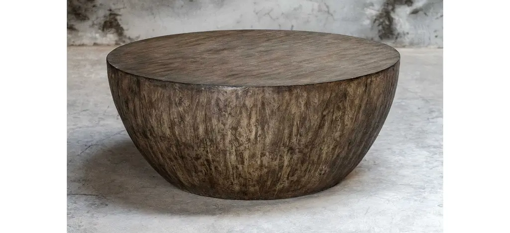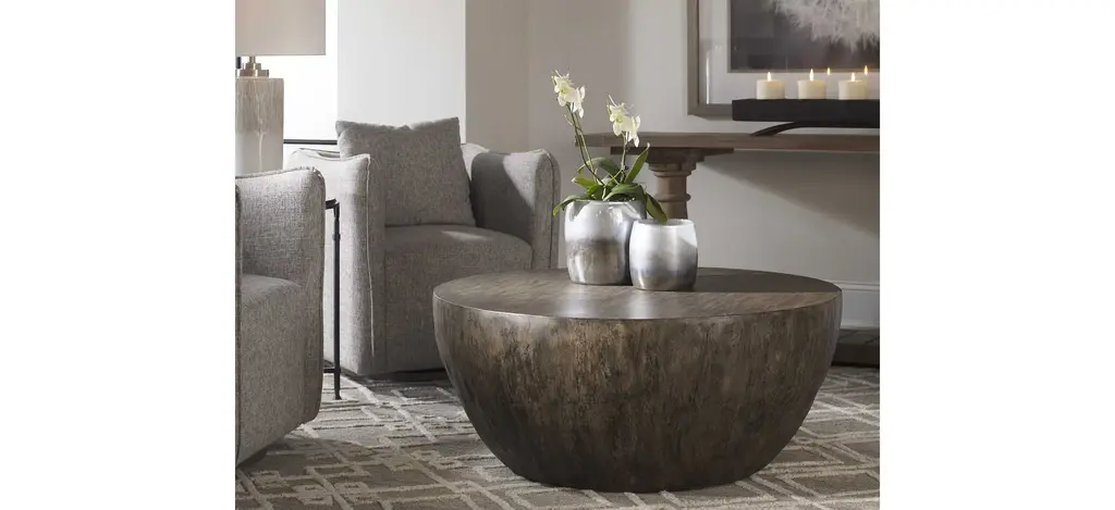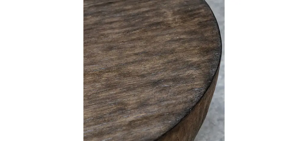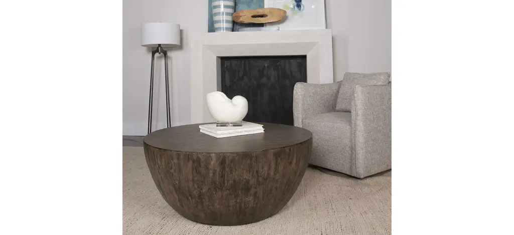 Showcasing a minimalist style, this round Lark Round Coffee Table features a mango wood veneer overlay in a heavily textured aged walnut gray finish.