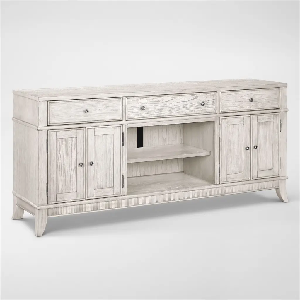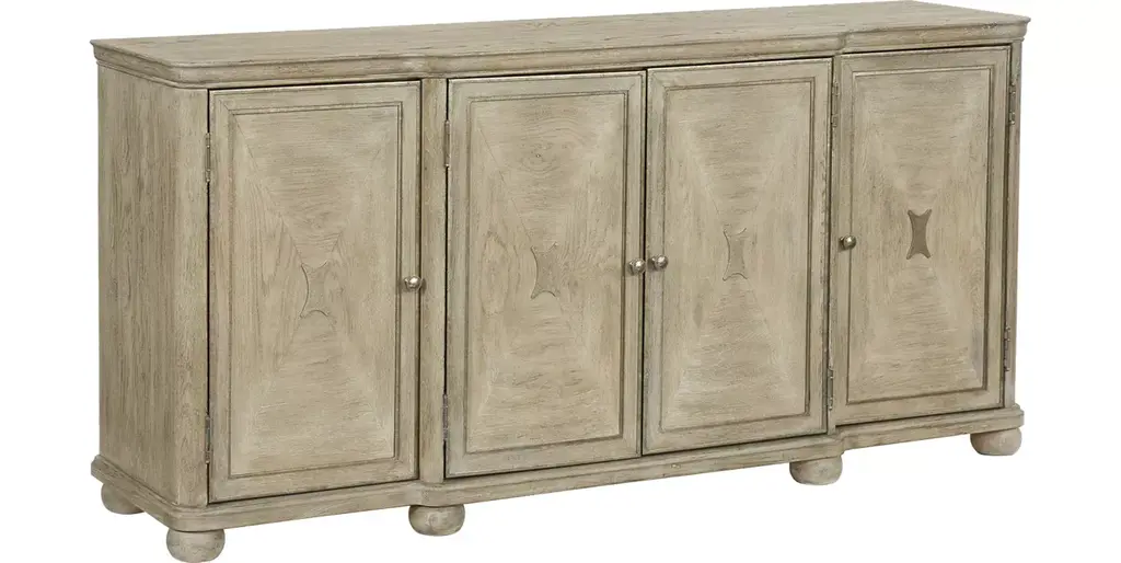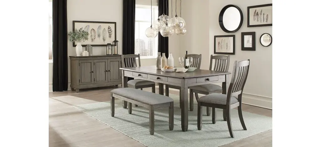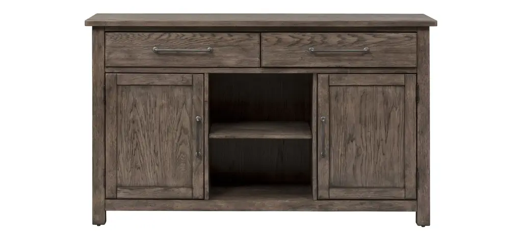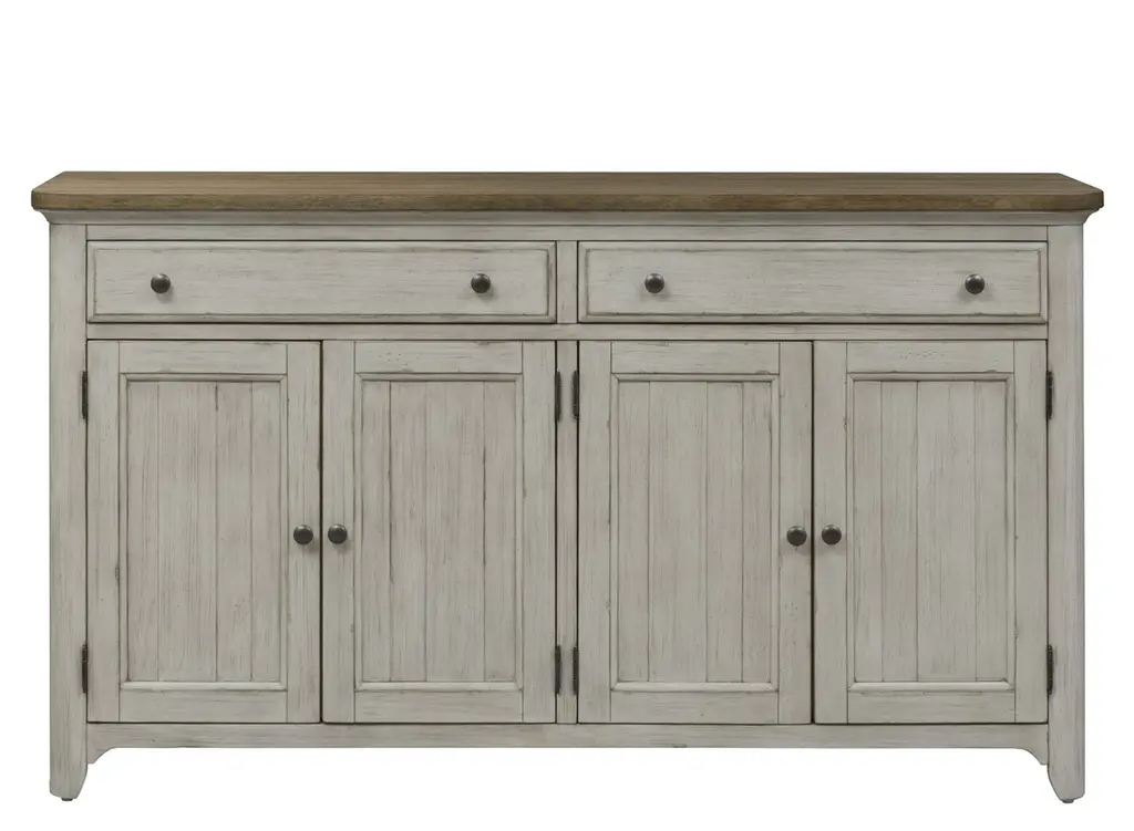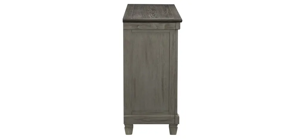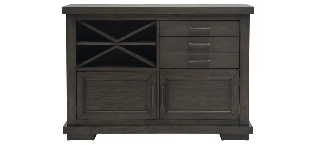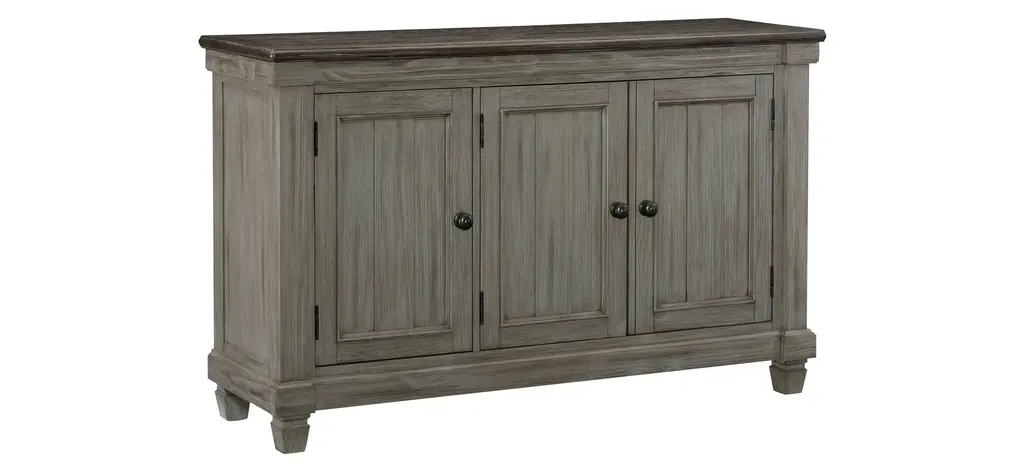 Inspired by the aesthetic of a casual country kitchen, the Lark server is an inviting gathering spot for mealtime with family and friends. The 3-door server provides ample space in which to store your tabletop accessories. The two-tone look of the acacia and pine solids base, finished in antique gray, and the oak veneer of the coffee-finished top, present as a harmonious combination of color, perfect for your home. The server doors feature dark metal knob hardware.