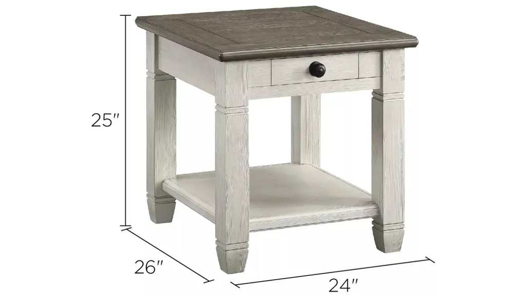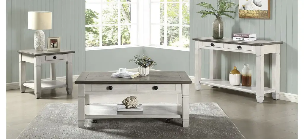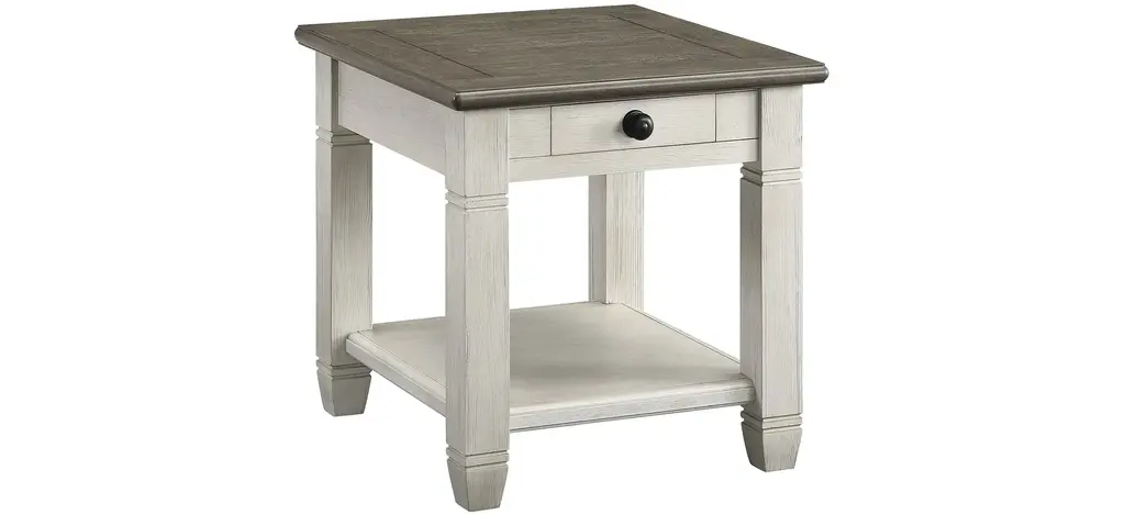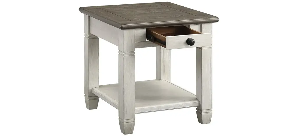 Inspired by the aesthetic of a casual country home and providing functional decorative accent for your living room is the occasional table set of the Lark End Table. The two-tone look of the acacia and pine solids base, finished in antique white, and the oak veneer of the end table's rosy brown-finished tops, present as a harmonious combination of color, perfect for your home. Dark finished metal knob hardware fronts the functional drawer while providing subtle contrast to the finish of the collection. An open display shelf creates a perfect spot for display of your decorative accessories.