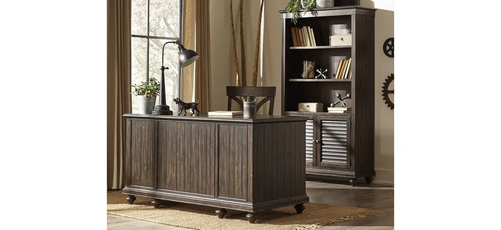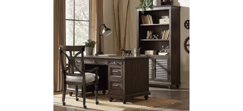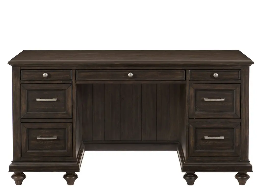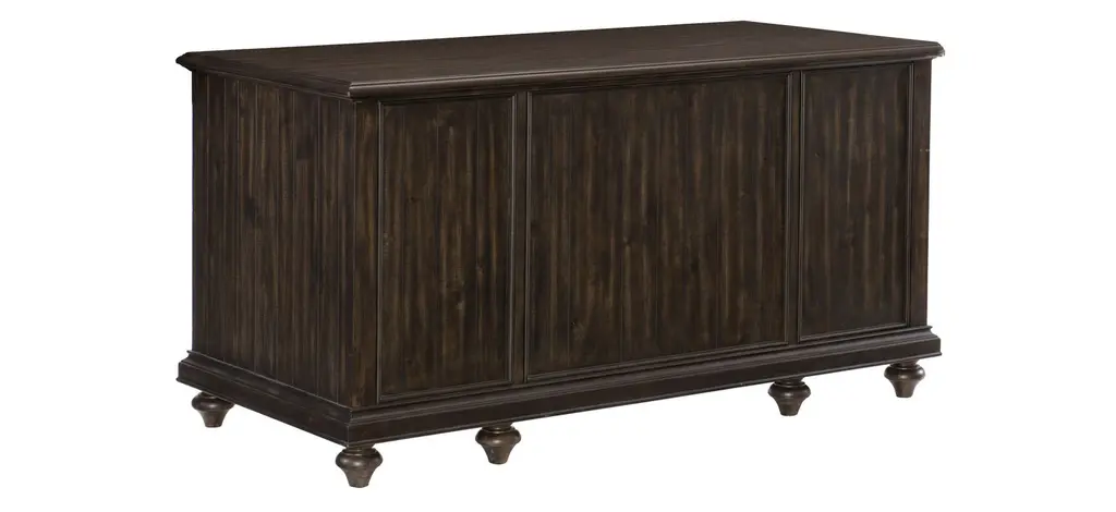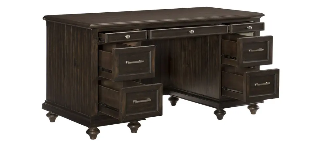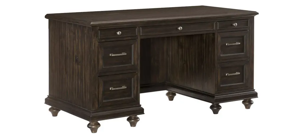 The solid transitional styling of the Larkin executive desk creates an impactful design presence in your home office. Utilizing distinct accent techniques – plank effect, rasping, saw marks – and pairing them with traditional framing and a rich finish – driftwood charcoal over acacia solids and veneers – creates a piece that is worthy of your home office. Pewter-finished hardware, mounted on the functional drawer, provides subtle contrast to the wood’s dark finish.