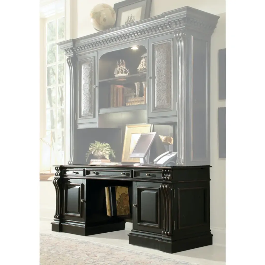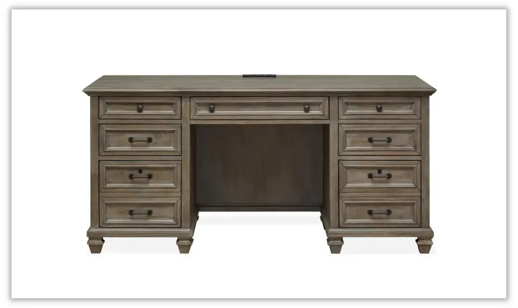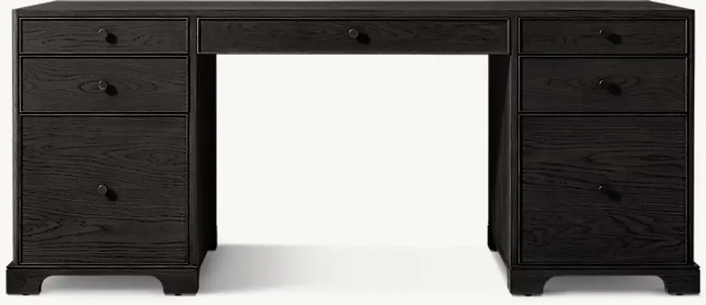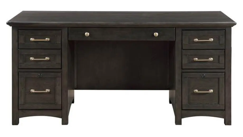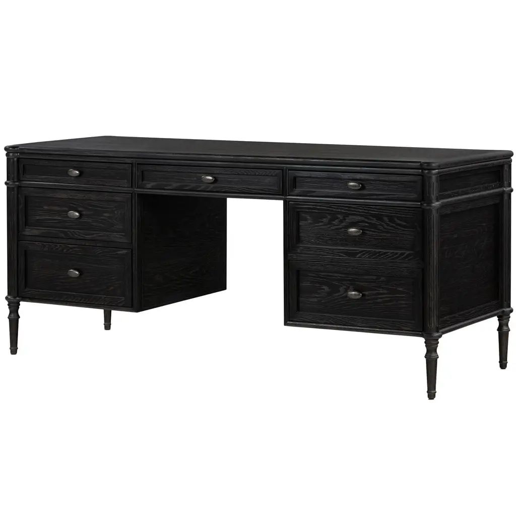 The solid transitional styling of the Larkin executive desk creates an impactful design presence in your home office. Utilizing distinct accent techniques – plank effect, rasping, saw marks – and pairing them with traditional framing and a rich finish – driftwood charcoal over acacia solids and veneers – creates a piece that is worthy of your home office. Pewter-finished hardware, mounted on the functional drawer, provides subtle contrast to the wood’s dark finish.