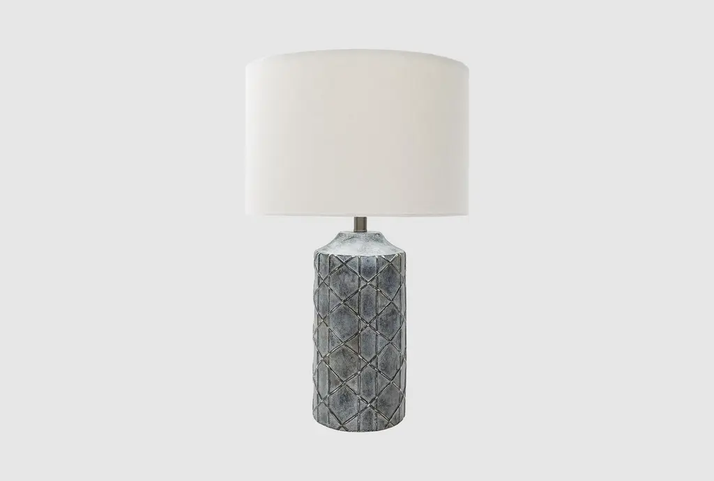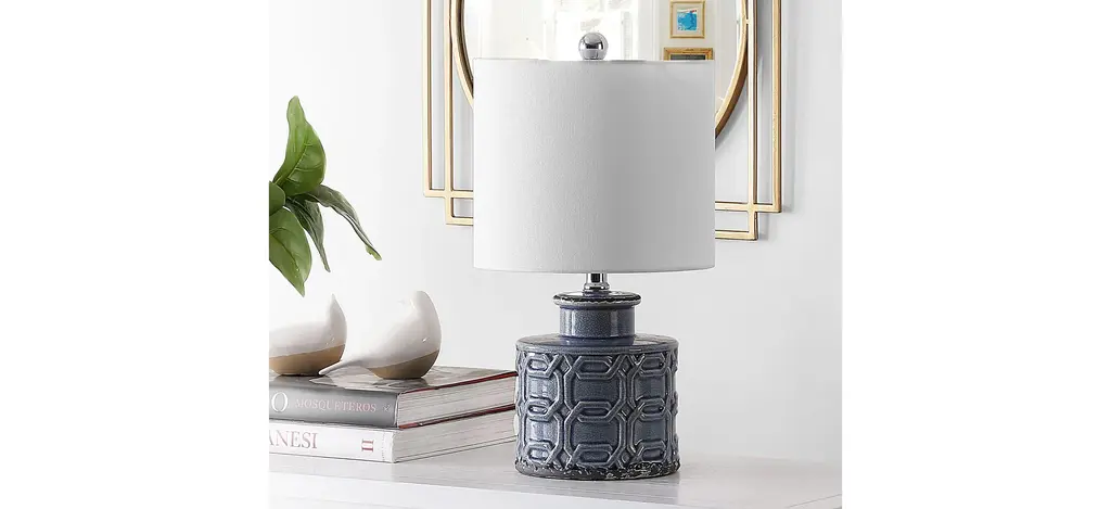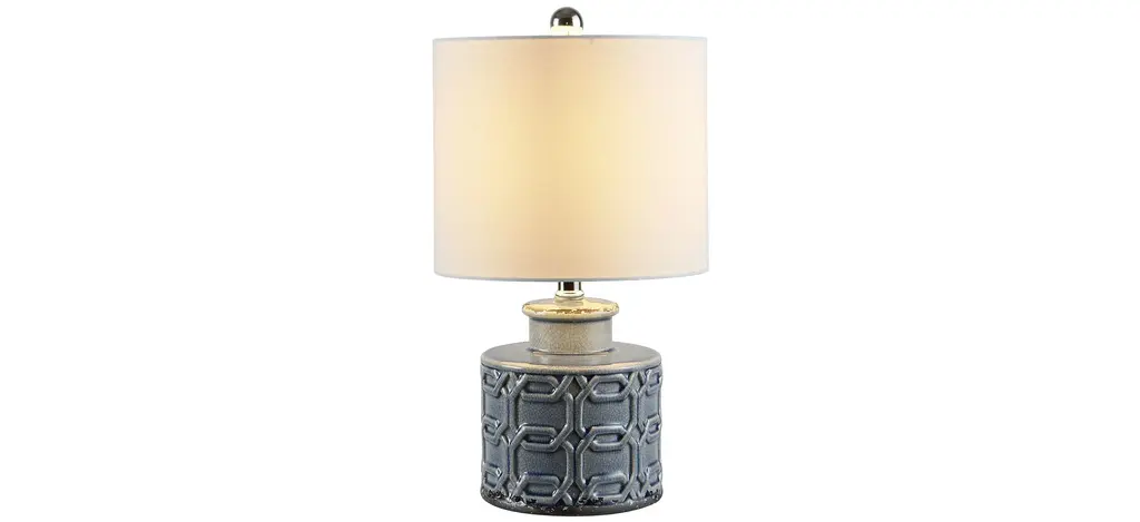 East meets west in this striking Larzen Ceramic Table Lamp. A one of a kind design fusion of the beloved Celtic knot and Chinese lucky coin motif, Larzen's textured interlocking pattern over its blue ceramic body brings exotic artistry to any d_cor.