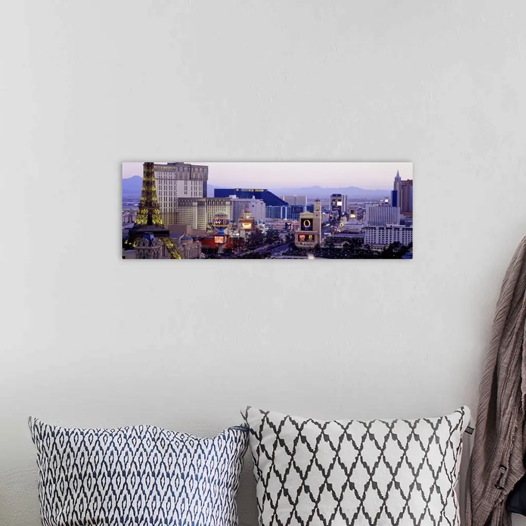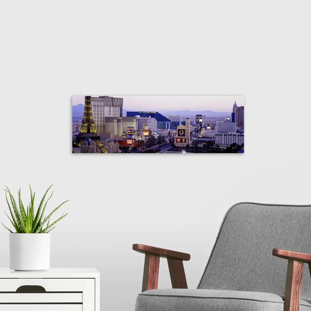 Panoramic photograph of ""Sin City"" skyline with mountains in the distance. The buildings are lit up and the neon signs are glowing.