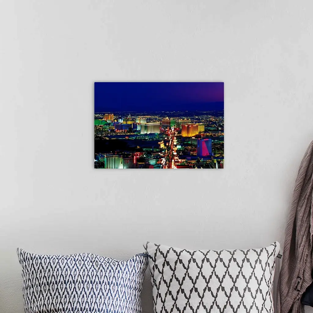 View from above of the Las Vegas strip its neon lights glowing in the night sky in a horizontal photograph.