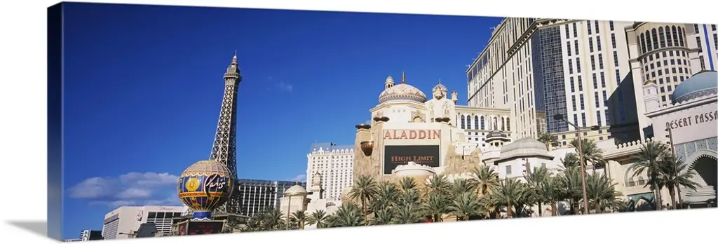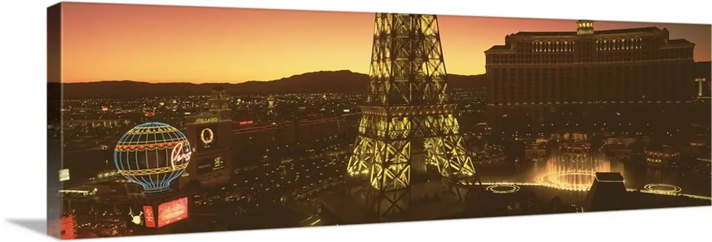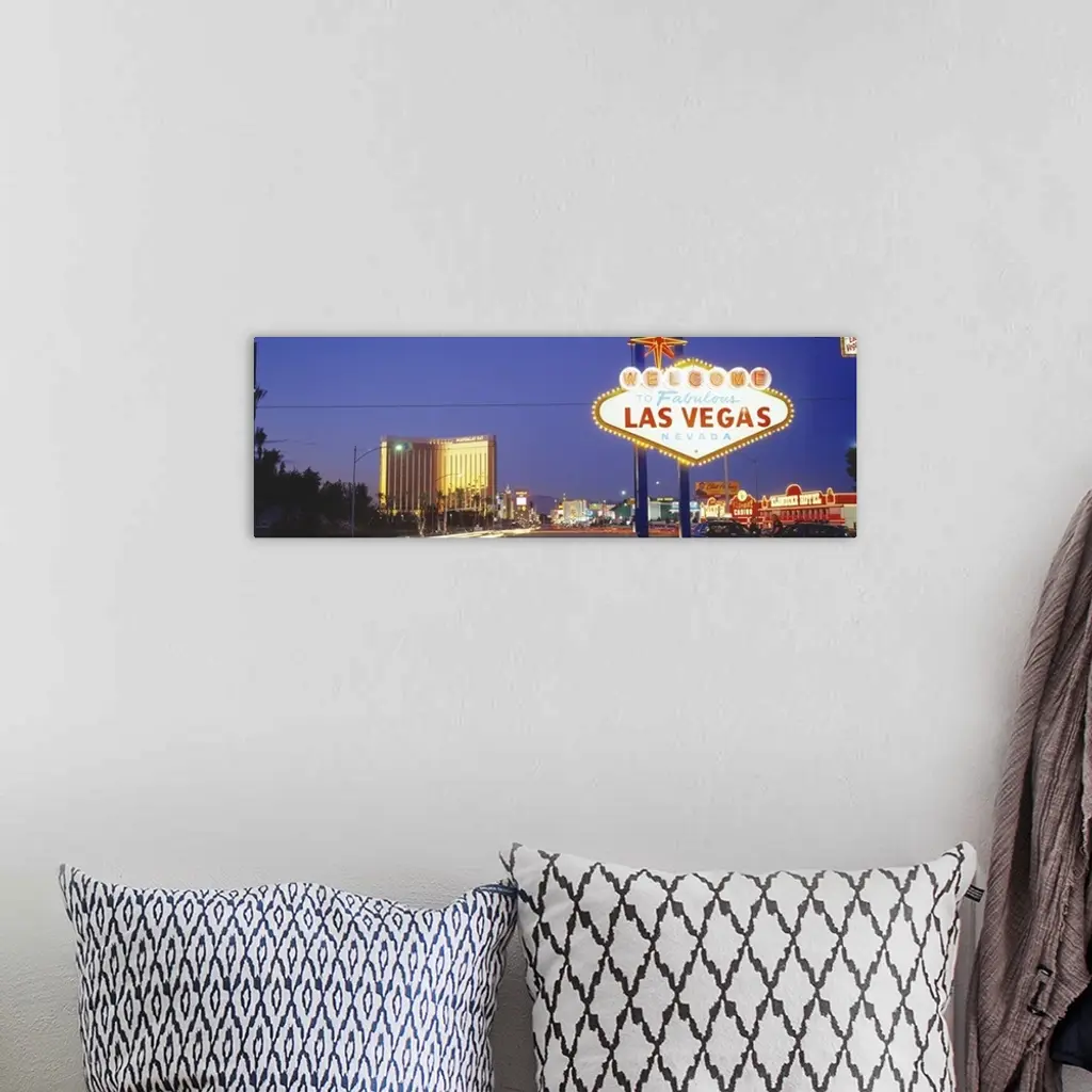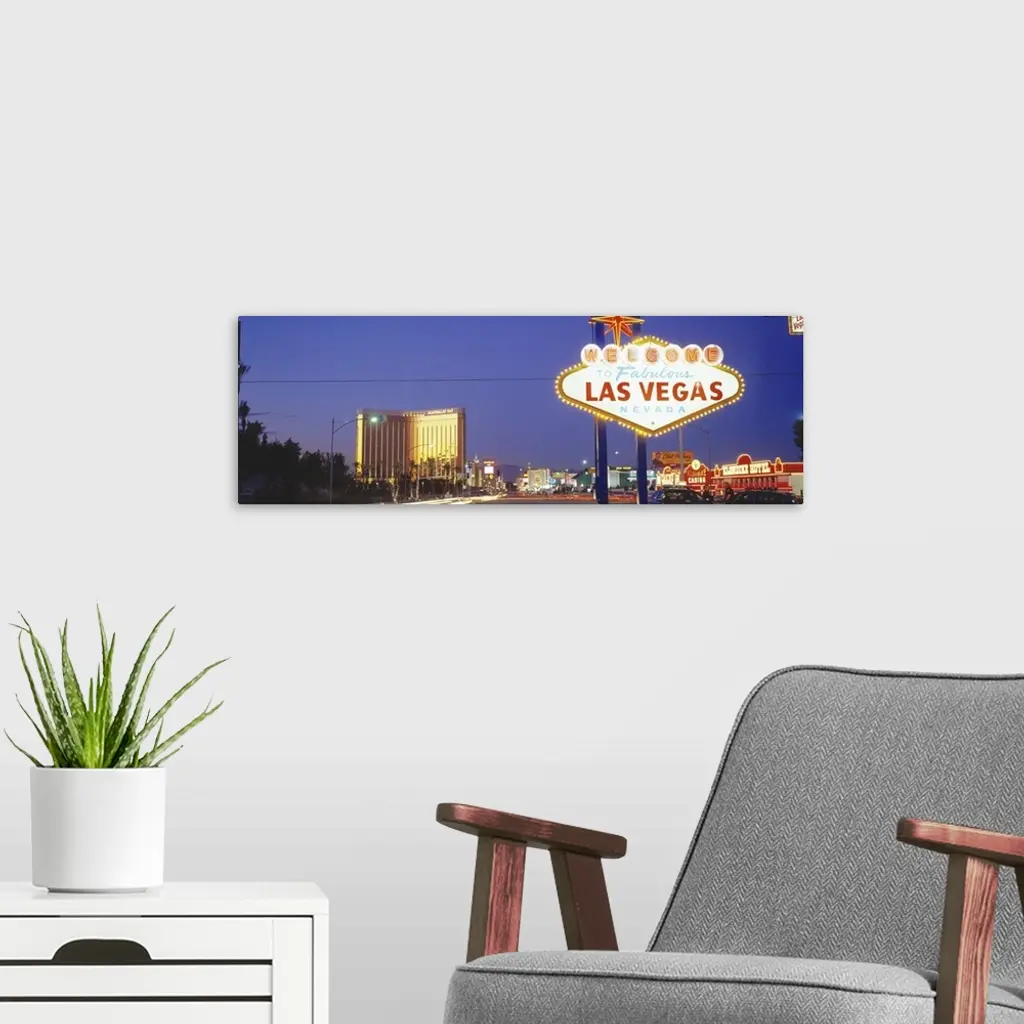 Giant photograph shows the famous neon sign that welcomes people as they enter the nicknamed "Sin City" located within the Western United States. Located behind the sign, the famous Mandalay Bay Resort and Casino can be seen towards the left hand side of the picture, while some of the other famous buildings and casinos of this busy city can be seen throughout the remainder of this picture.
