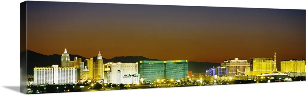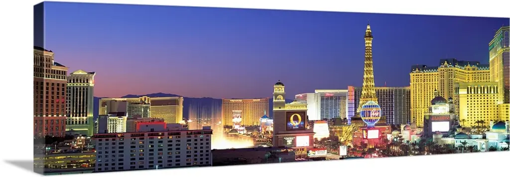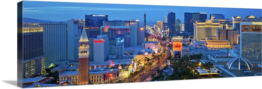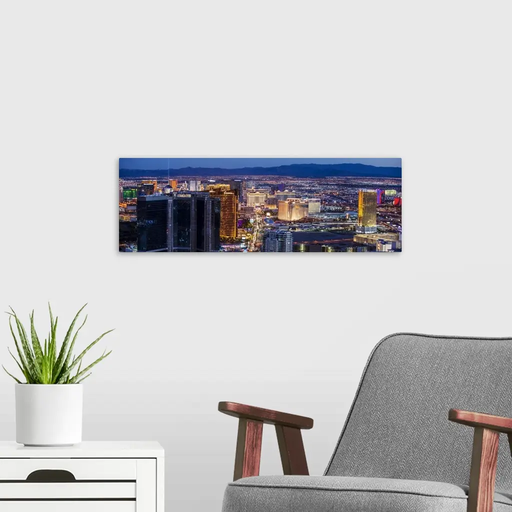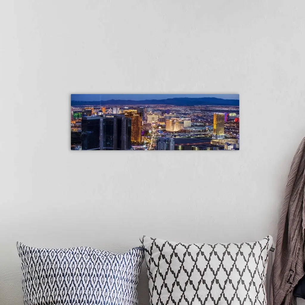 Panoramic photograph of an aerial view of the Las Vegas strip lit up at night.
