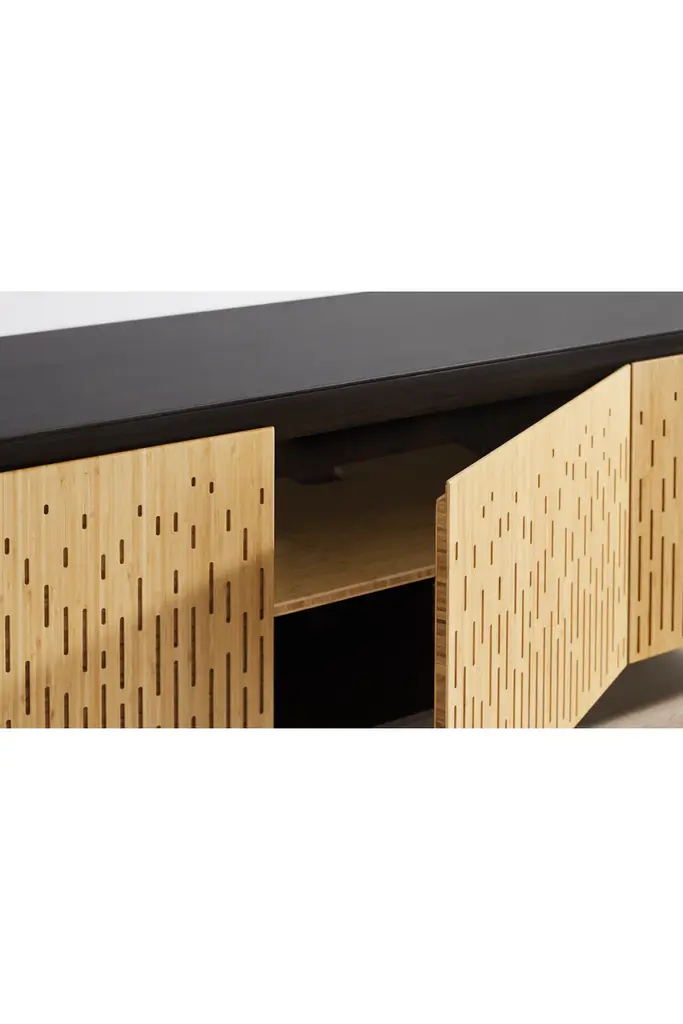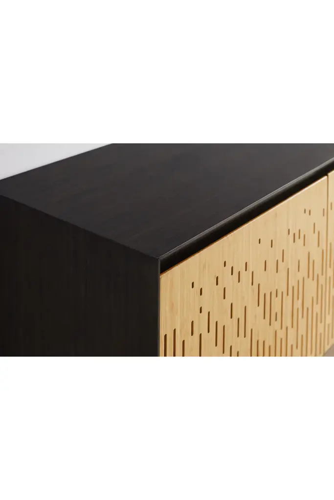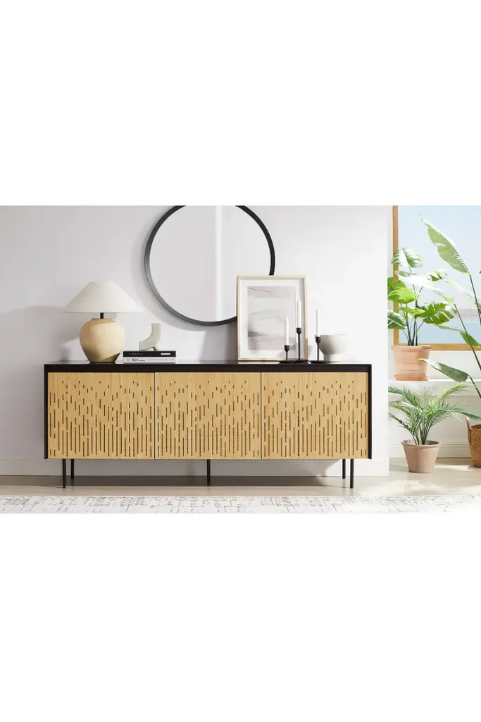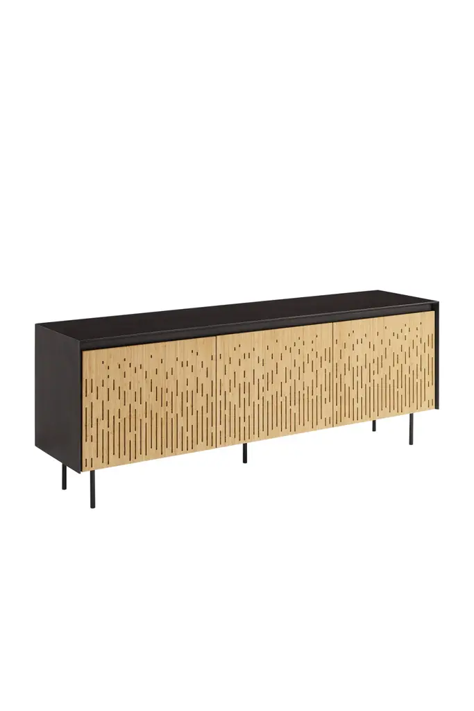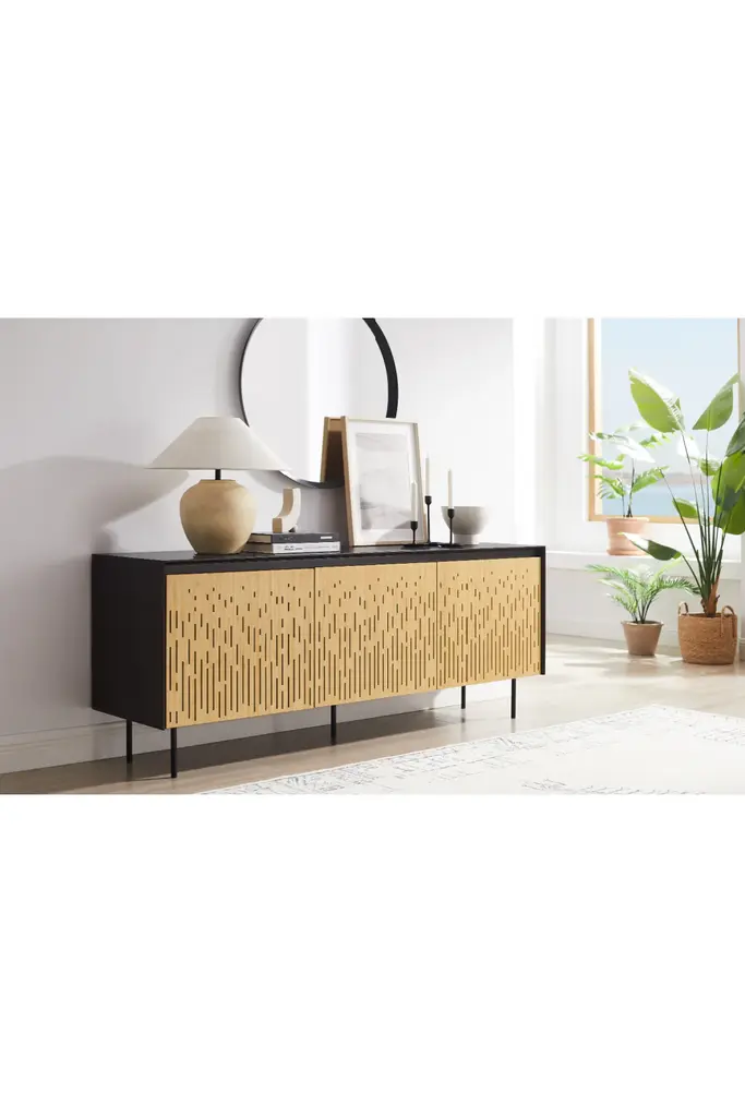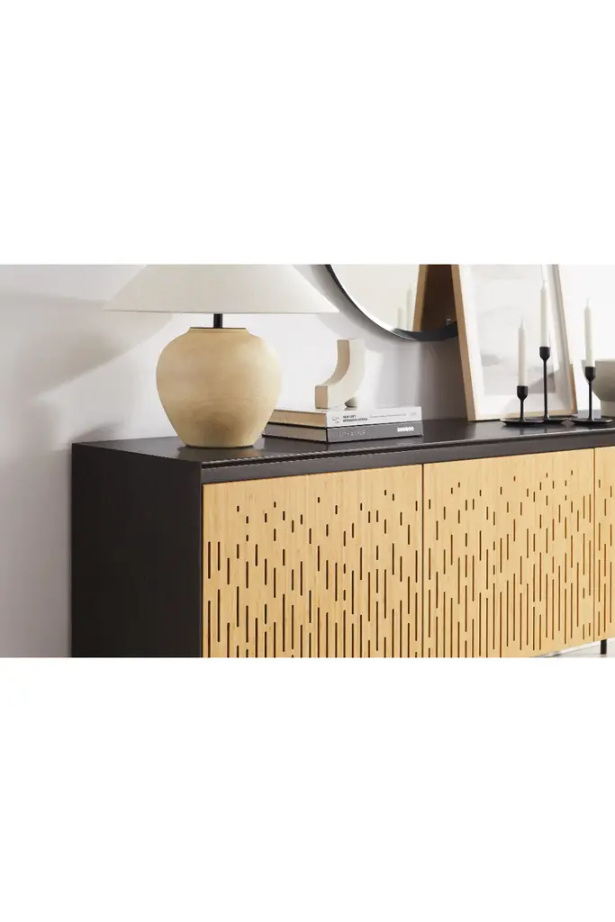 Introducing the Hanna Console - a stunning blend of classic modern design and glamorous style. Handcrafted with sustainability in mind, this console features sleek waterfall doors in a chic Caviar finish, paired with natural Wheat accents. The innovative laser cut doors offer both minimalist appeal and striking detail. With a slim steel base, soft-close doors, ample shelving, and hidden cord management, this console is perfect for any space in your home. Elevate your living space with the sophisticated Hanna Console.