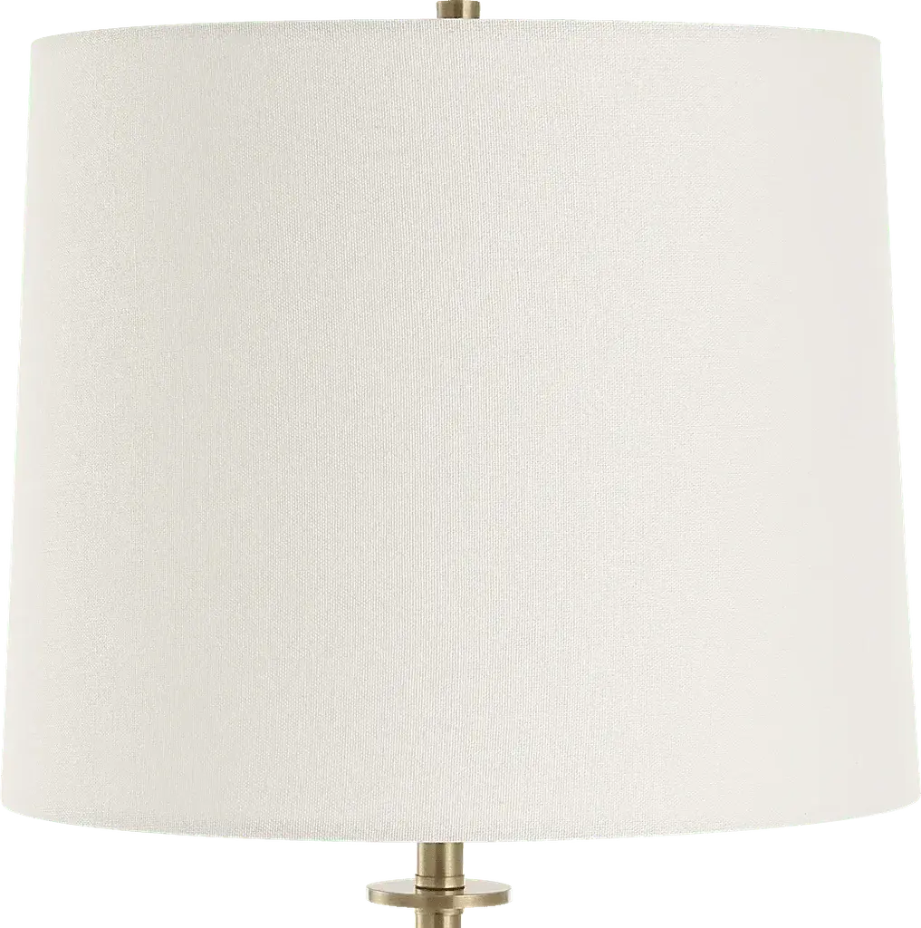 The Lasky Bend Brass Lamp features a sleek, sophisticated plated brass base with a complementary foot, elevated by the addition of a striking black dolomite marble orb. The slightly tapered round hardback shade is covered in a casual white linen fabric. Partial assembly may be required.