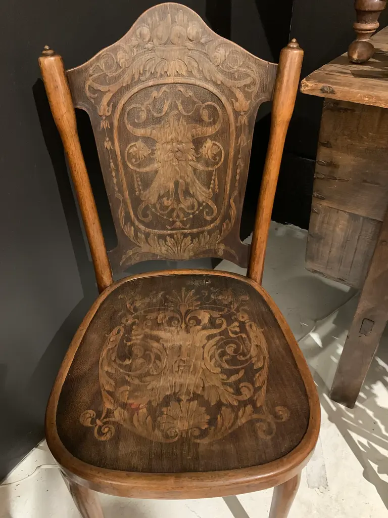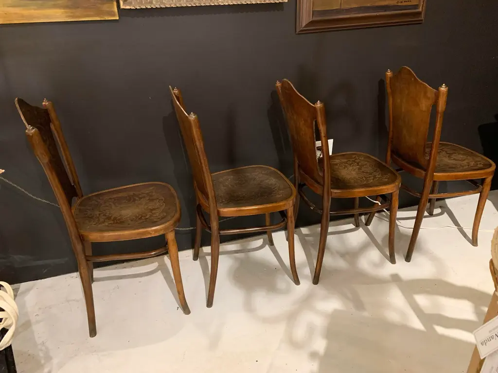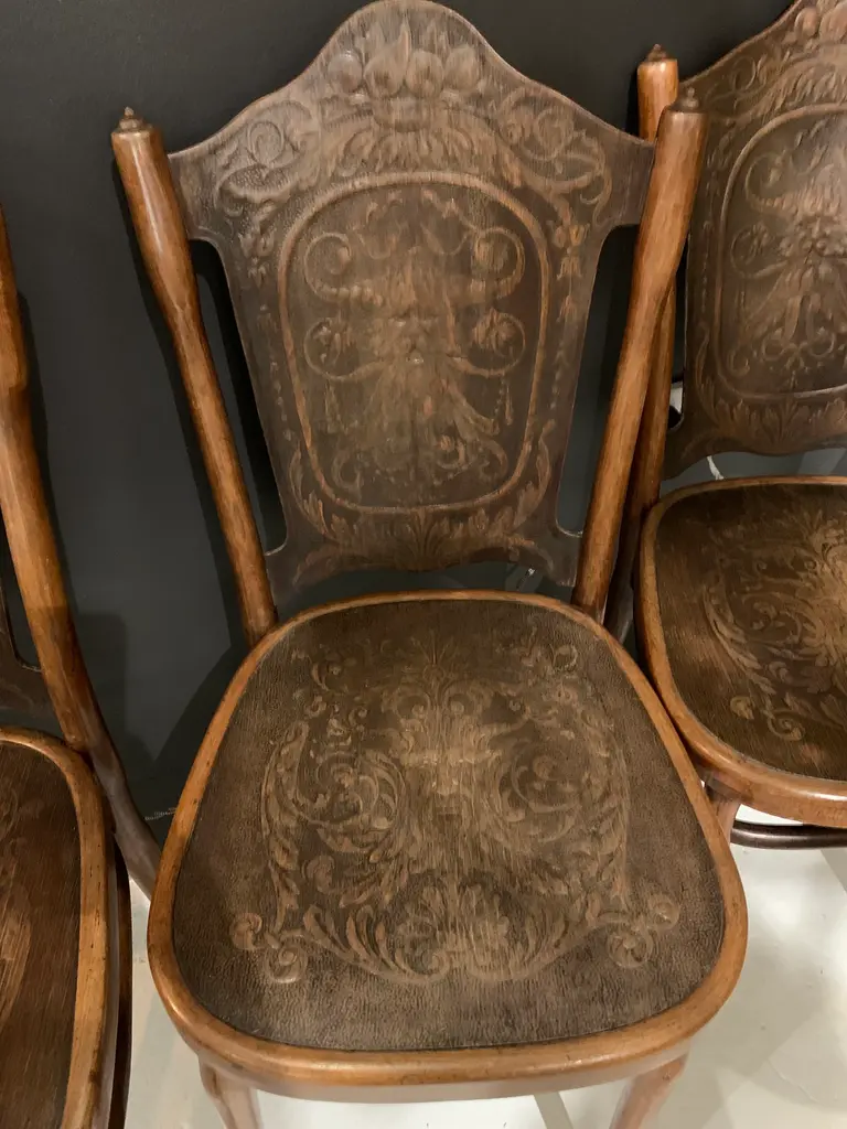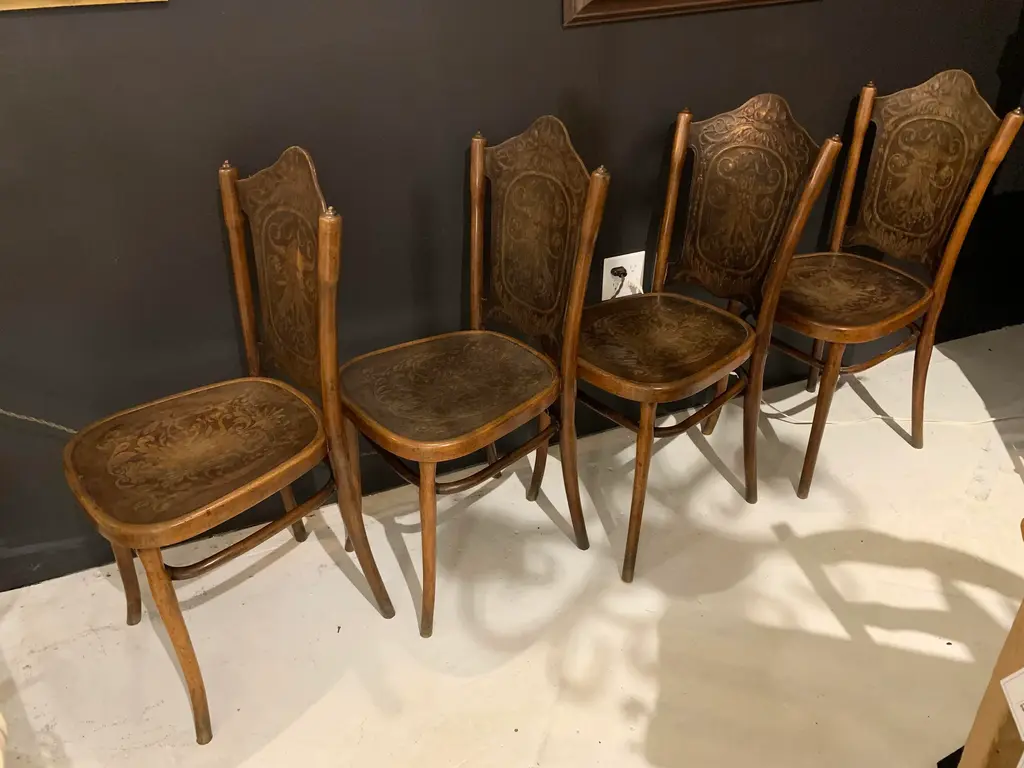 Original Jakob & Josef Kohn, father and son furniture makers, chairs from Vienna, Austria. They were made in the late 1890's. They are bentwood chairs made from Austrian Beechwood, known as the Vienna Secession Chair No. 67. They are worn in all the right places with a beautiful rich patina and embossed backs and seats. Two of the chairs have some splitting on the bentwood corner of the trestle. However, the function and the integrity is not compromised. There are 4 chairs total. Wear & tear typical for chairs over 130 years old is present.