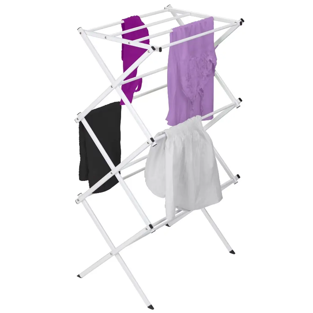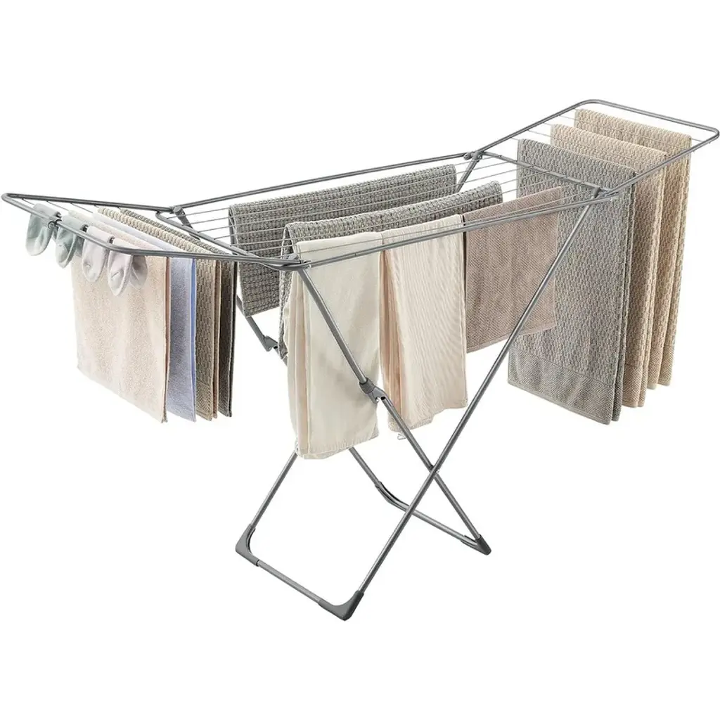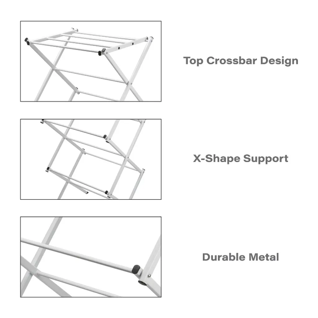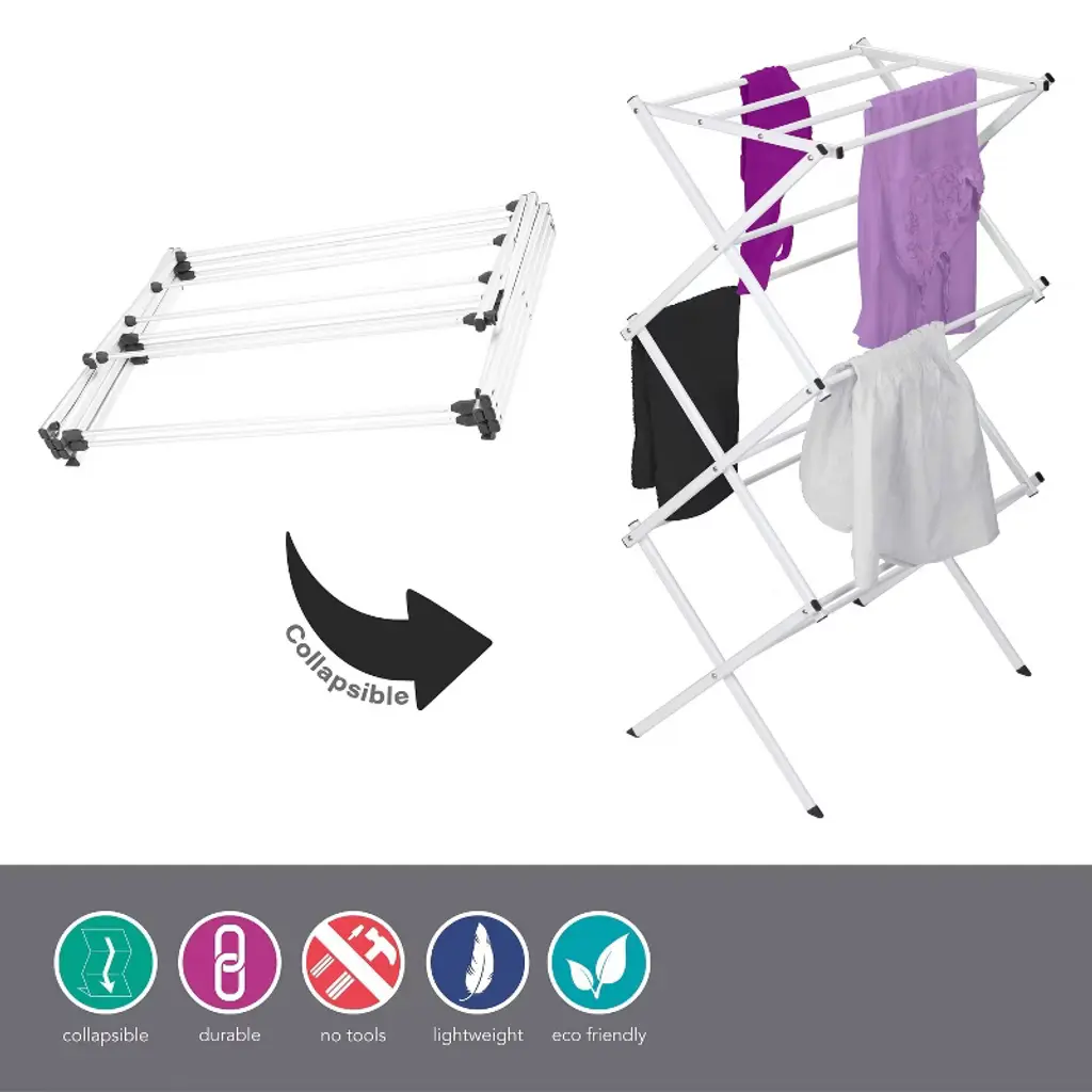 The Laundry 360 compact drying rack lets you dry your clothes while saving energy. It can be placed inside the house or outside in the sun, saving the time of setting up a clothesline. It also folds neatly for space-saving storage between uses. This clothes dryer rack offers over 18ft of linear storage space and features four closely spaced bars on the top row for items that need to lie flat, like sweaters, and seven more bars down the sides and middle, which are spaced for maximum capacity. It is also suitable for garments that are too delicate to be placed in an electric dryer. drying clothes in this fashion helps get out wrinkles so clothing looks smooth and sleek. It is also an easy way to dry linens such as bath towels, hand towels, wash cloths and bathmats. Usage: Dry clothes naturally, remove wrinkles, keep clothes smooth and sleek Benefits: collapsible, durable, fully assembled, lightweight, eco-friendly.