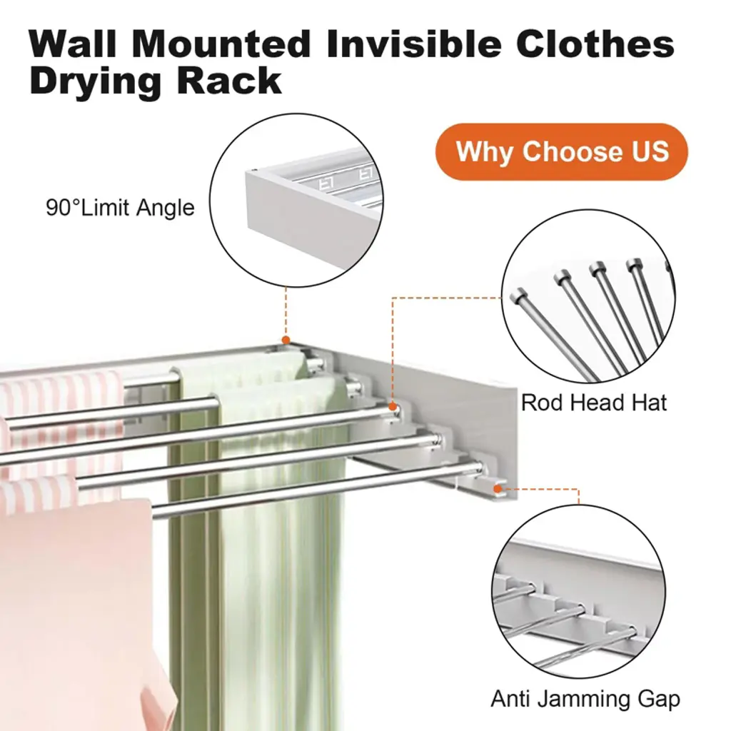 Product DescriptionThis retractable drying rack is easy to install and mounts securely on your wall, helping you maximize your space without clutter. When not in use, simply fold it back against the wall to keep your area neat and tidy. The multiple rods provide ample room to hang a variety of garments, towels, and other laundry items, allowing them to dry evenly and quickly.Product FeatureFoldable wall-mounted design saves space in any roomHeavy-duty alloy construction with sturdy rods for reliable useEach rod supports up to 22 lbs, ideal for heavy laundryRust-resistant materials for indoor and outdoor durabilityModern white finish complements any home décorIncludes clear instructions and all necessary hardware for easy installationPerfect for bathrooms, balconies, or laundry roomsCombines functionality with sleek, space-saving styleProduct information Size:80CM: 31.5 x 15.7 x 4 inchesItem Weight: 6.17 poundsMaterials: Stainless steel pipe+carbon steelColor: WhitePackage List: 1x Wall mounted drying rack1x Assembly kit1x Assembly guideFriendly note:Ensure the wall surface is clean, dry, and sturdy before mounting.Follow the included instructions carefully for proper installation.Double-check all screws and brackets to ensure stability.Avoid overloading the rods to maintain durability and prevent bending.Fold the rack flat against the wall when not in use to save space.Clean the rack with a damp cloth to keep it looking fresh and rust-free.