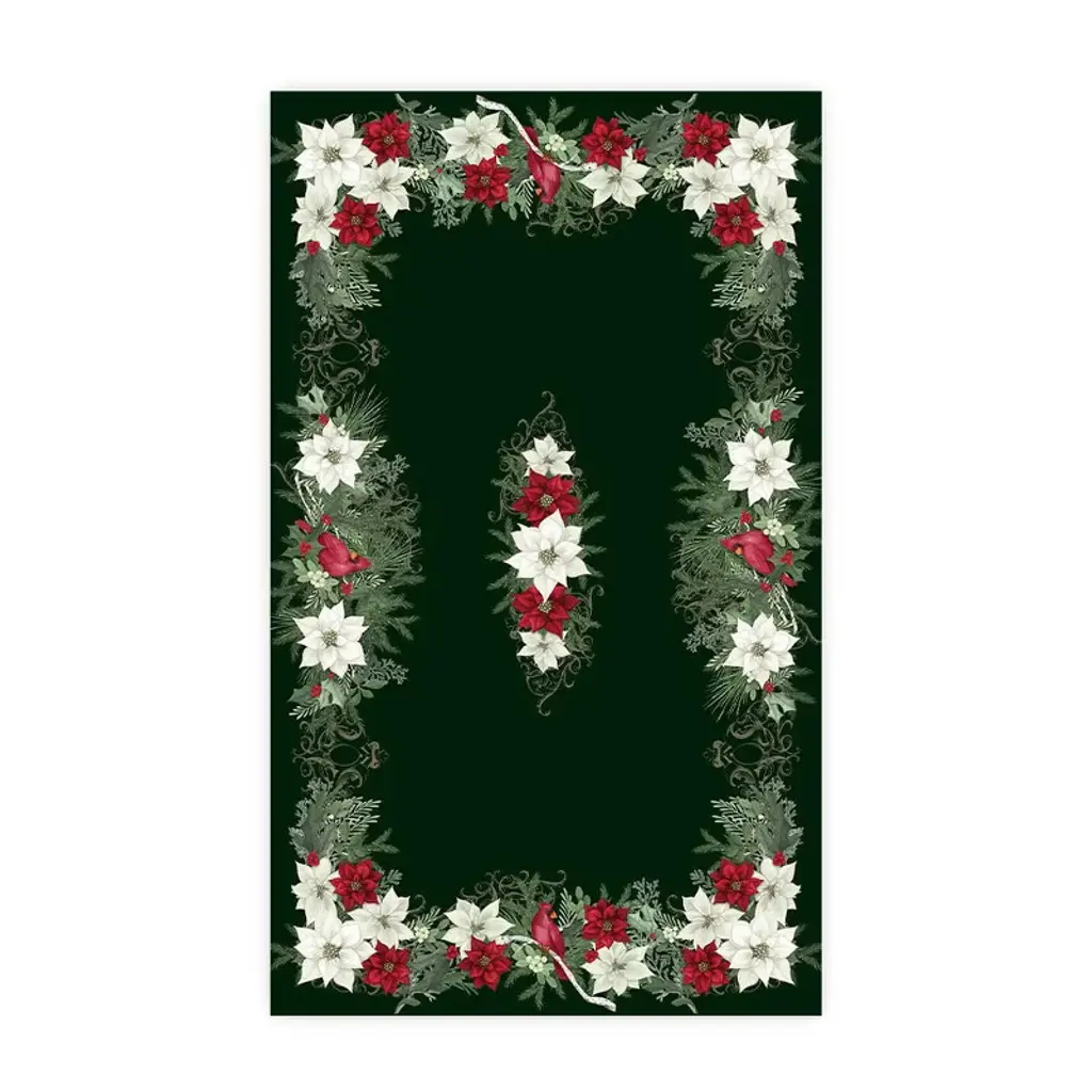 To many, the holidays are the most wonderful time of year. The Christmas Elegance tablecloth features bold cardinals surrounded by bright white and red poinsettias. Details of greenery and branches make the perfect nest on a dark green background. Make your home merry and bright with this classic tablecloth.