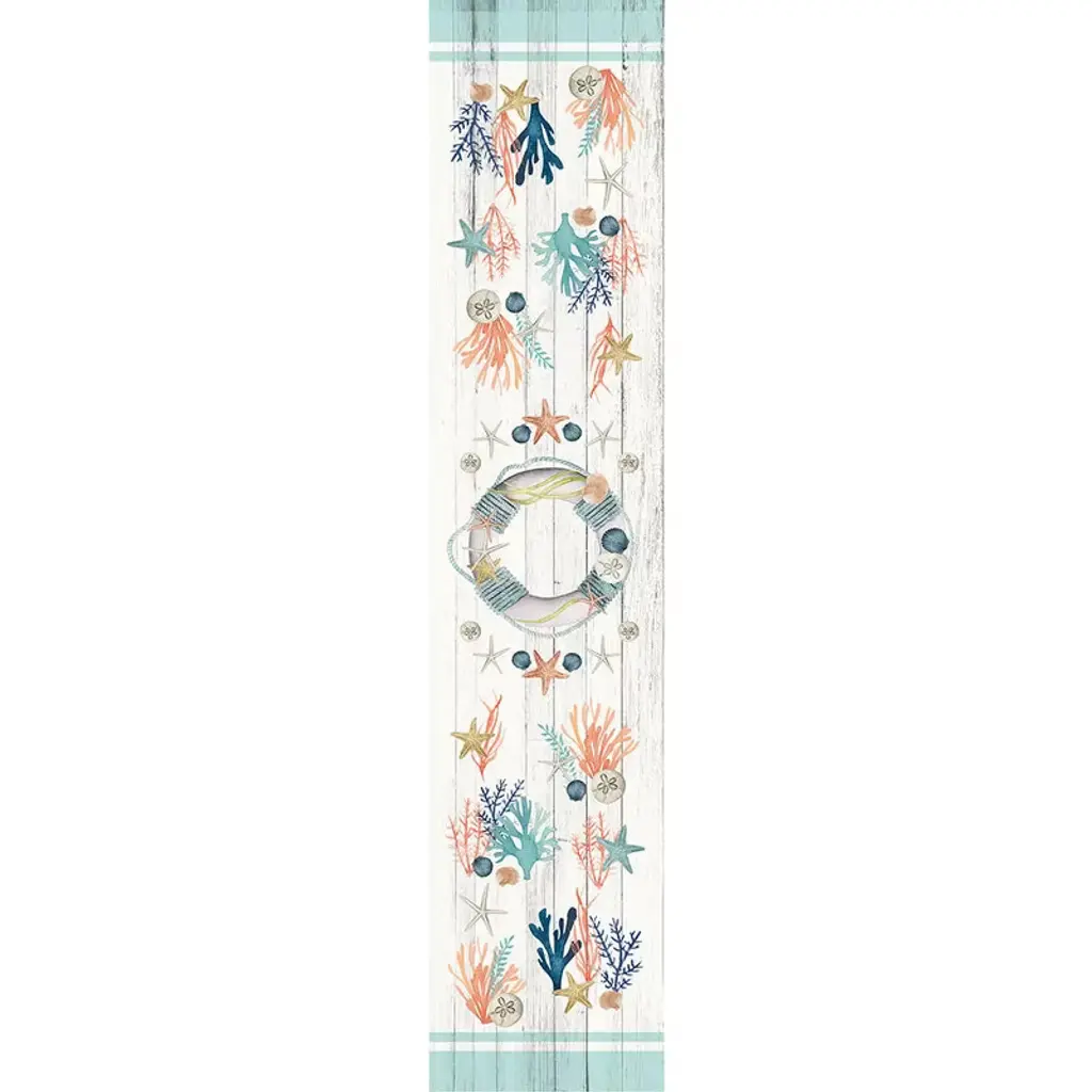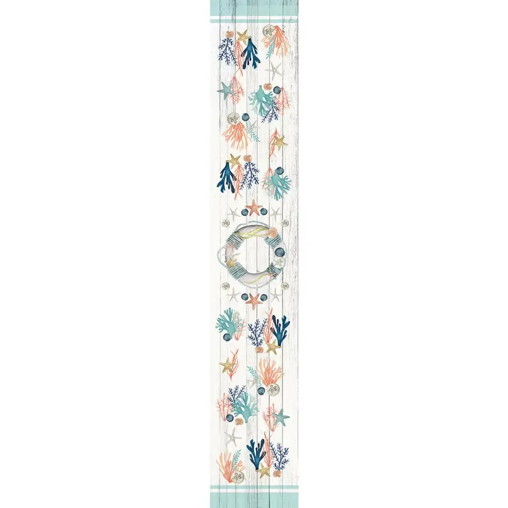 Enhance your dining experience with a beautiful display of deep sea colors, shells, and seaweed. The layout displays coral, turquoise and blue reef life on an off-white shiplap background anchored by a life preserver in the center. The Laural Home Coastal Reef Table Runner is a great addition for anyone with a sophisticated taste for coastal decor.