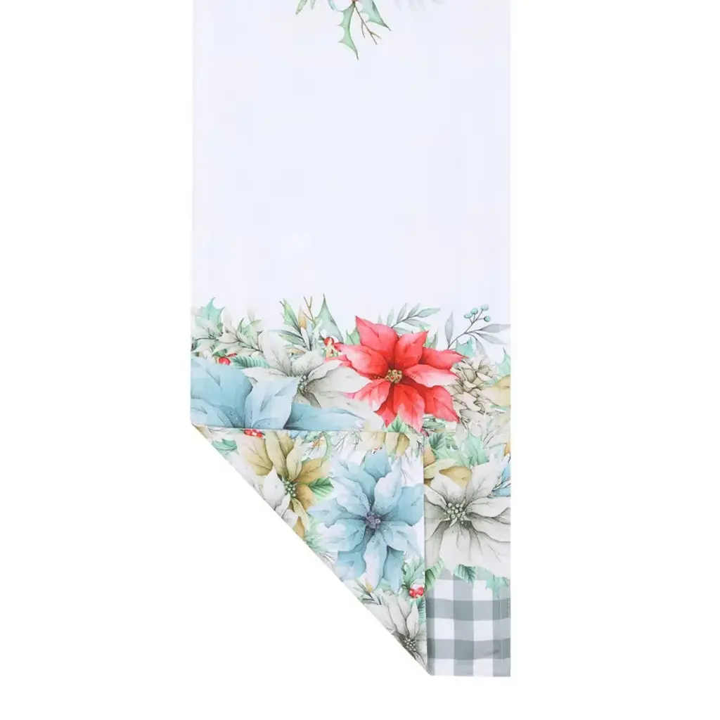 "Glad Tidings" is a chic and modern holiday reversible runner design. Dusty blue, mushroom, ruby red, and golden mustard watercolor poinsettias, placed on holly and a green-grey gingham pattern, create the epitome of a new take on a classic Christmas. Spread cheer around your table this season with the "Glad Tidings" reversible runner.