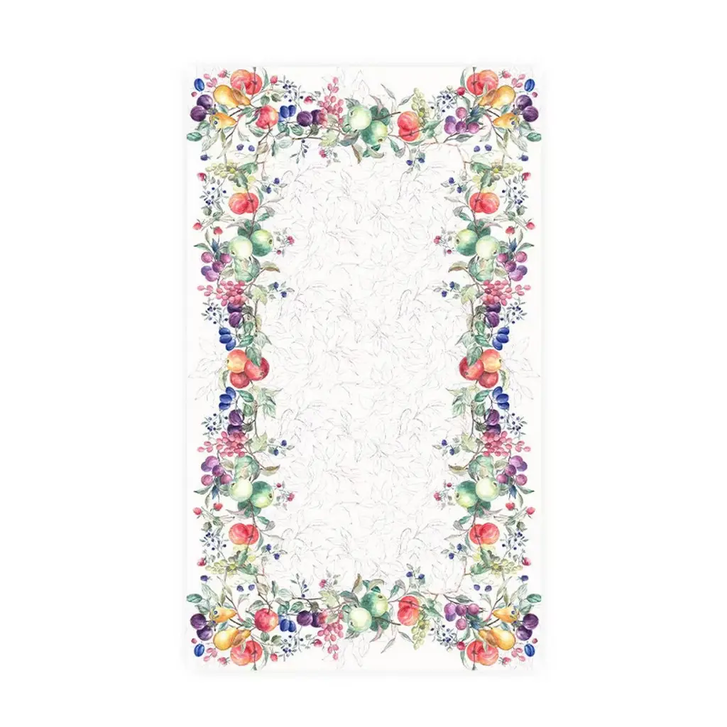 This food-inspired tablecloth, "In the Orchard," features an abundance of watercolor fruit. Nestled on the border are soft green leaves with rich colored fruit; apples, peaches, plums, and pears are some, to name a few. The center features delicate dark brown line drawings of leaves on an off-white background. This tablecloth will add a special touch of elegance to your everyday table.