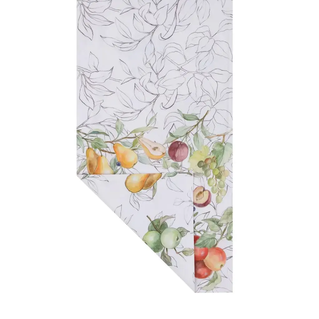 This food-inspired reversible runner, "In the Orchard," features an abundance of watercolor fruit. Nestled on the ends are soft green leaves with rich colored fruit; apples, peaches, plums, and pears are some, to name a few. The center features delicate dark brown line drawings of leaves on an off-white background. This reversible runner will add a special touch of elegance to your everyday table.