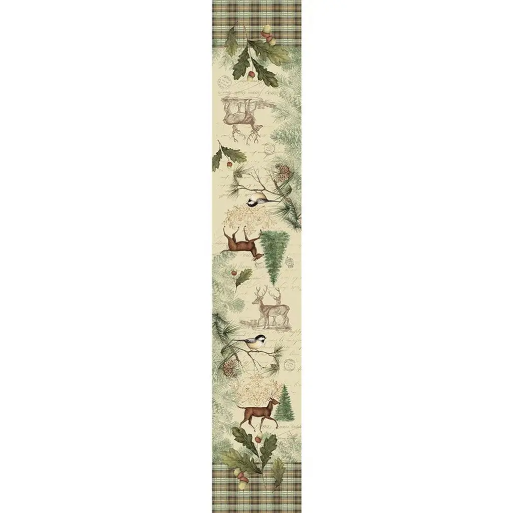 Set your table with the tranquil spirit of nature with Laural Homes Woodland Forest table runner. This design features images of deer, sparrows, and pine trees gracefully tied together by a refined color palette of green and cream to make for a versatile year-round look.