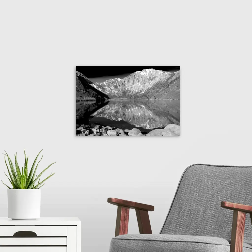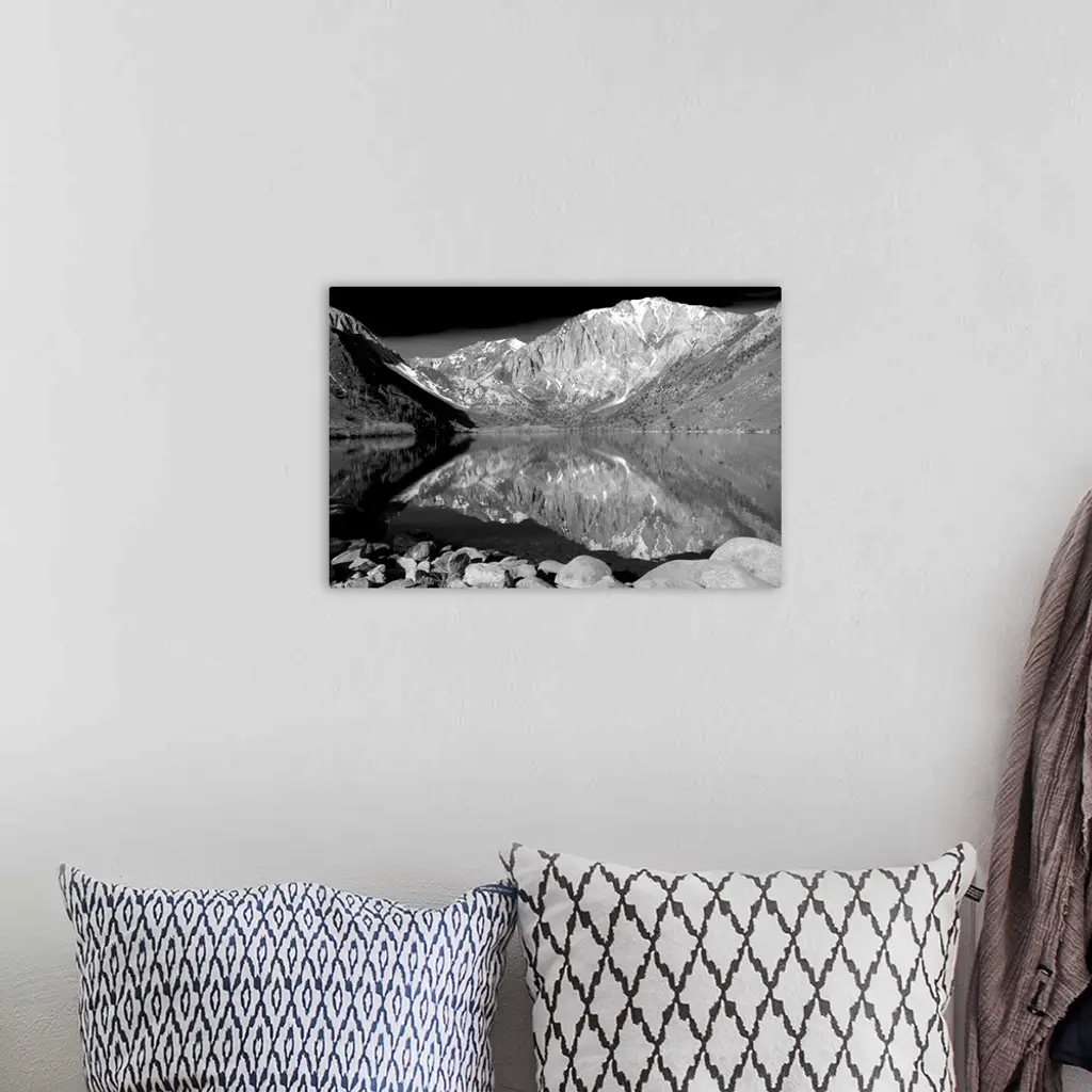 Black and white landscape photograph of Laurel Mountain peak reflecting into a lake in the foreground.