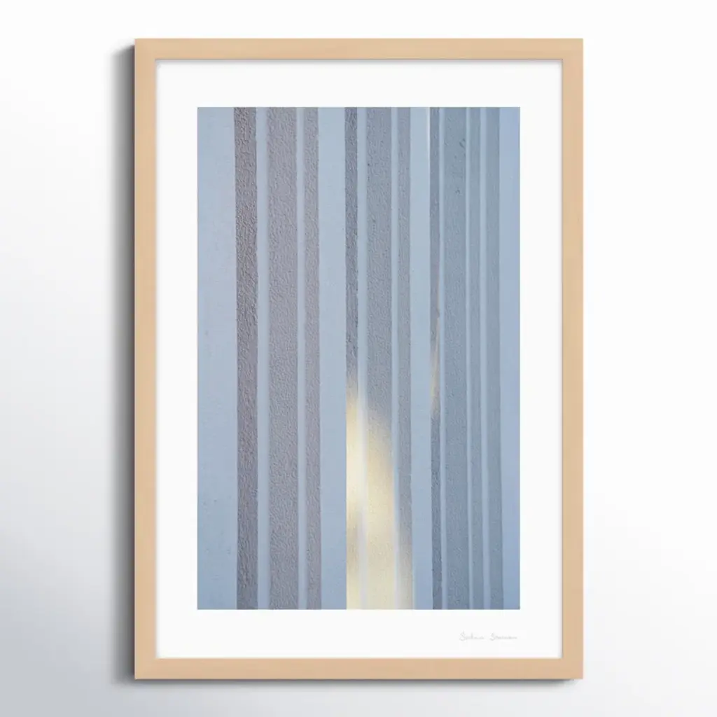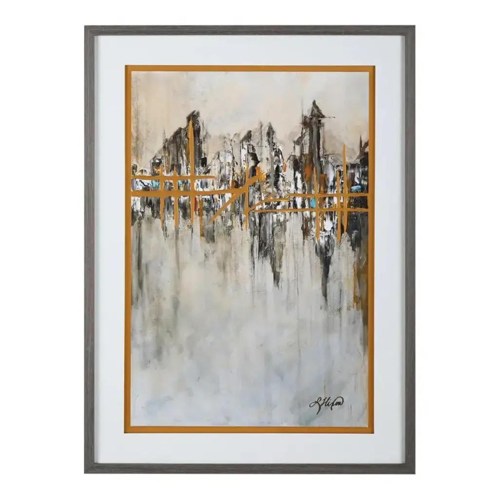 Oslo Remembered by artist Lauren Hixon is reminiscent of her travels in Norway. This ethereal memento is adorned with tones of hand-painted gold atop painted gray mat. This gorgeous print on watercolor paper is displayed from a gray gallery frame, completing the look.