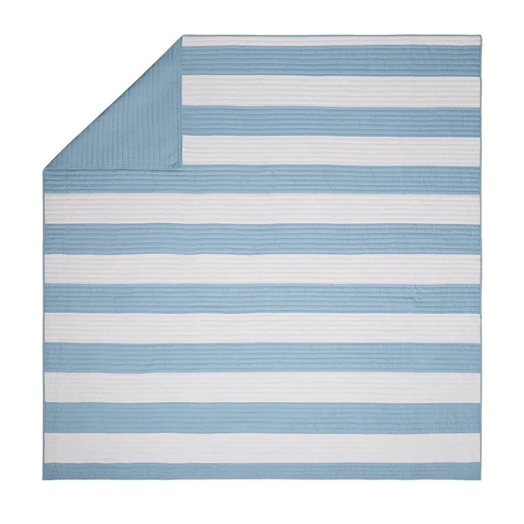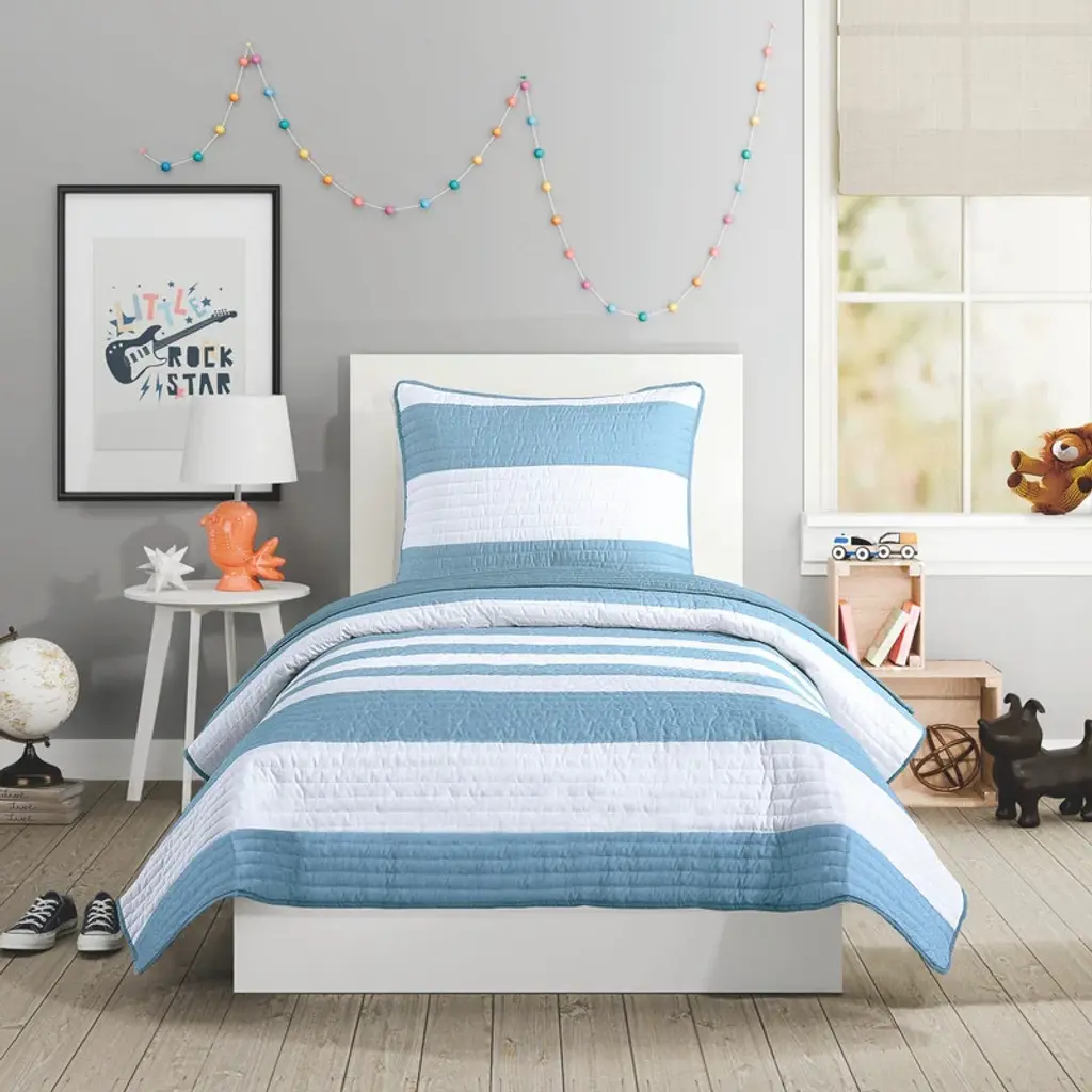 Refresh your bedroom with this soothing blue and white stripe Lavelle Quilt Set. Made from 100% microfiber with lightweight polyester fill, this quilt set ensures durability and a soft, cozy feel. Reverses to a coordinating solid light blue. Machine washable for easy care and low maintenance.