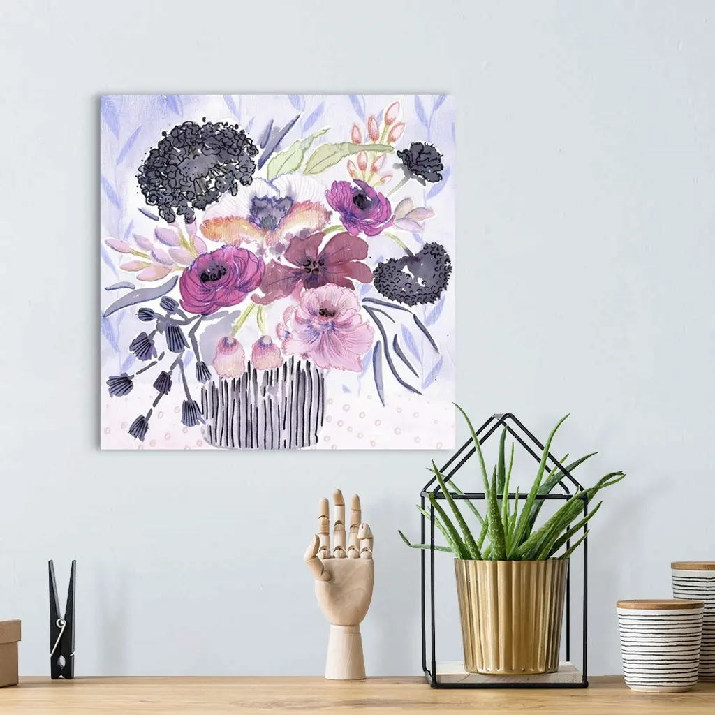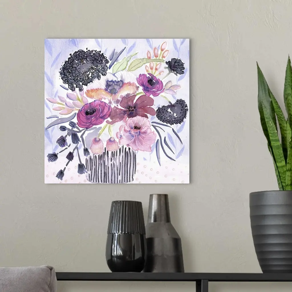 Watercolor art print of a bouquet of purple and lavender flowers in a striped vase.