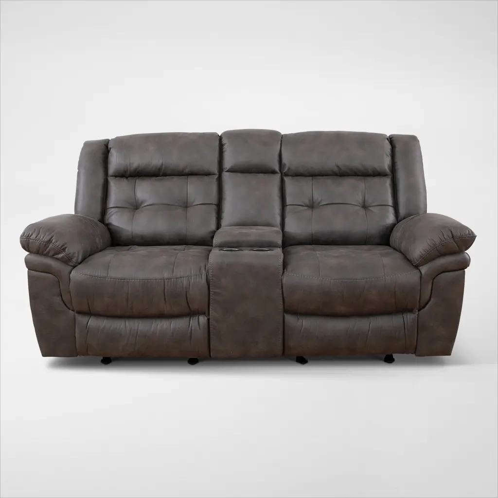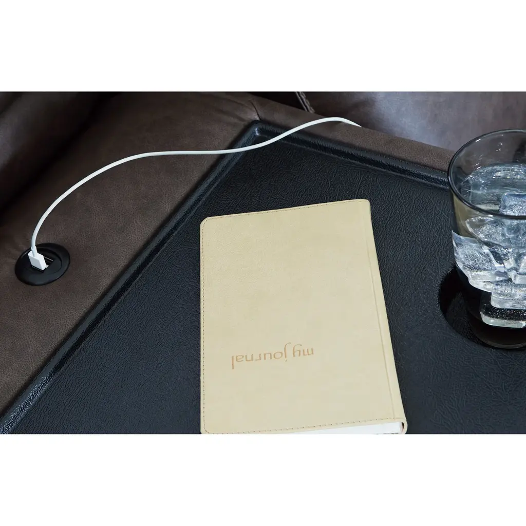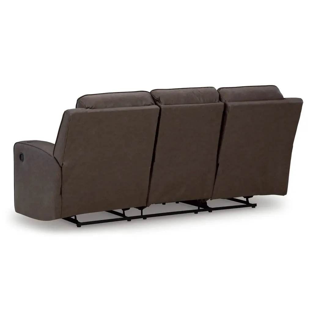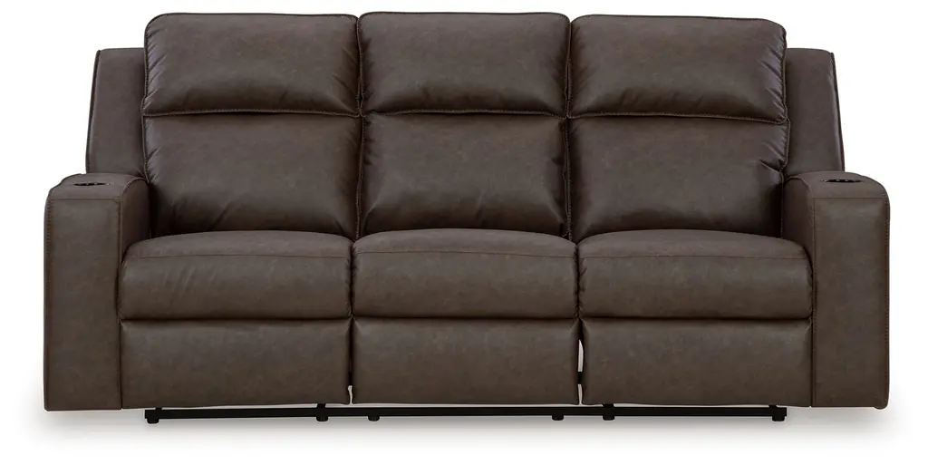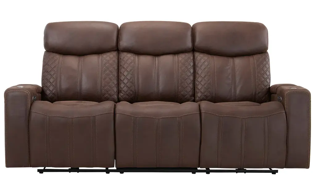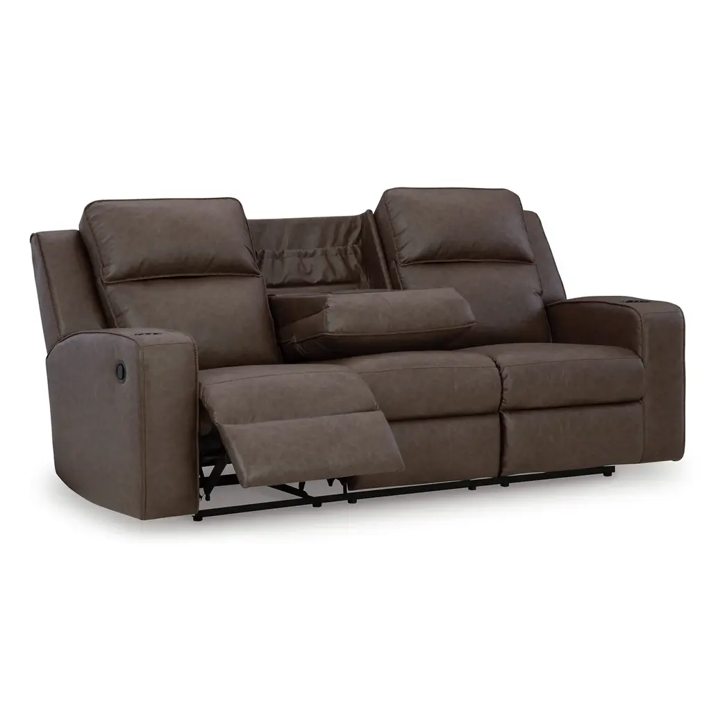 Indulge your desire for comfort and love for contemporary design with the Lavenhorne Reclining Drop Table Sofa. Designed with easy everyday living in mind, the sofa's heavyweight padded faux leather fabric upholstery makes it practical, while the contrast jumbo stitching accents give it a fashion-forward flair. The sleek track arms add a modern sensibility that elevates the look and feel of the design. The dropdown table with USB charging and dual cup holders keeps everything you need to relax within easy reach. The high-resiliency foam cushions wrapped in thick poly fiber bring exceptional comfort and supreme relaxation to your home.