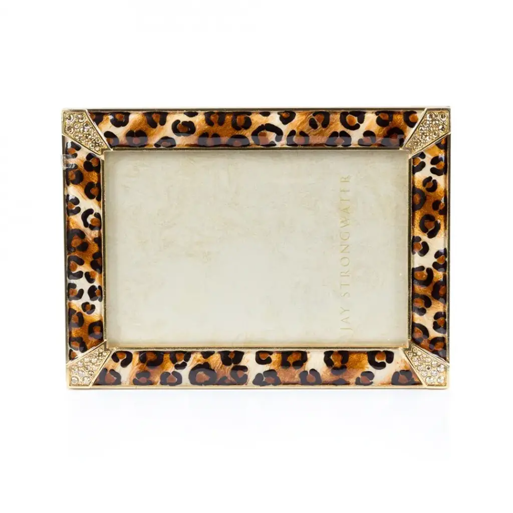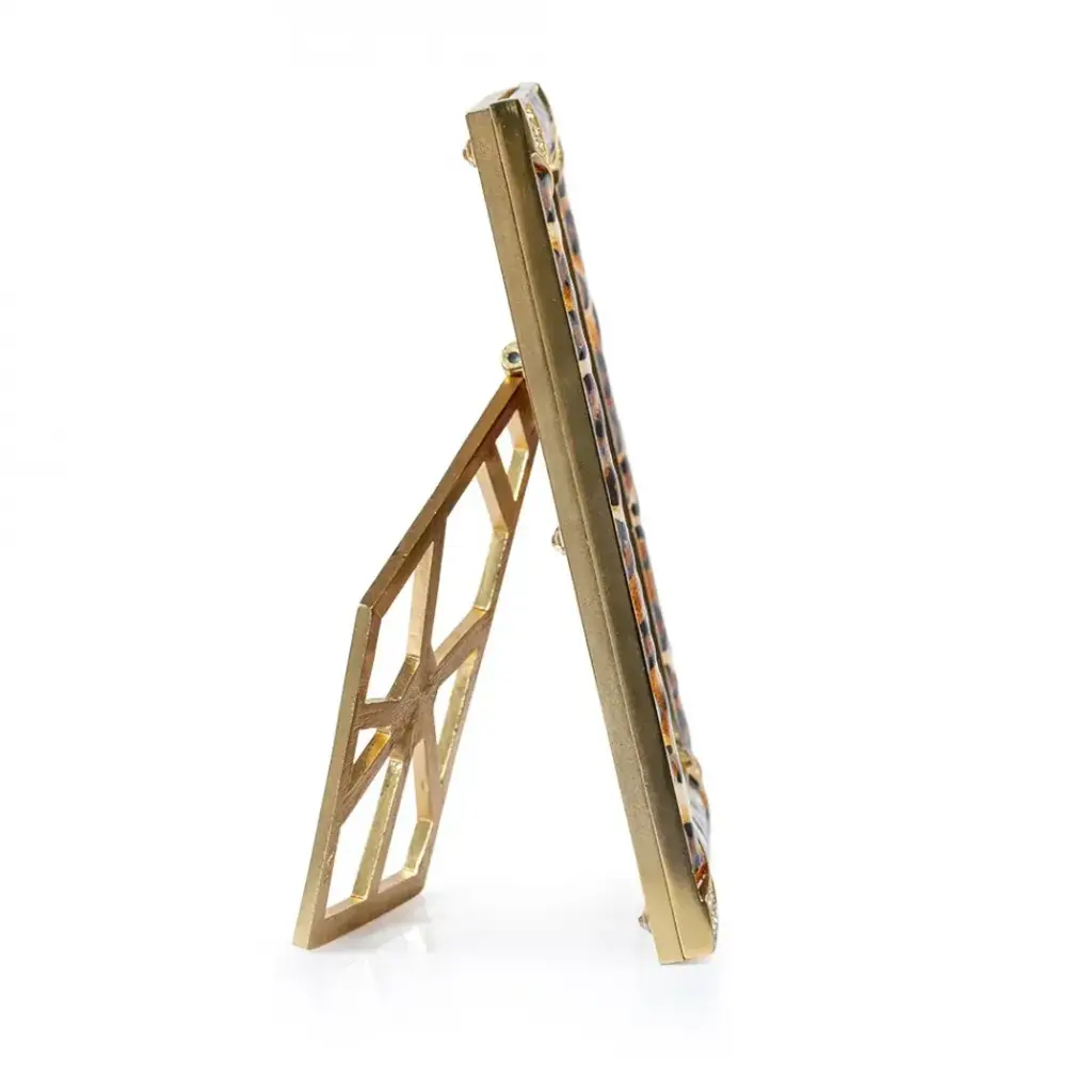 The 4x6 Lavinia Frame in Leopard is a bold and sophisticated statement piece that will add a touch of wild elegance to any space. Crafted with meticulous attention to detail, the Lavinia frame is embellished with a stunning leopard print pattern and accented with shimmering European crystal pavé corners. Made from premium materials, including durable zinc and plated in elegant 14K gold, the Lavinia Frame promises to showcase your precious moments with unrivaled beauty and a hint of exotic allure. Metal back plate and kickstand, the frame is truly beautiful from any view, stands horizontally and vertically.