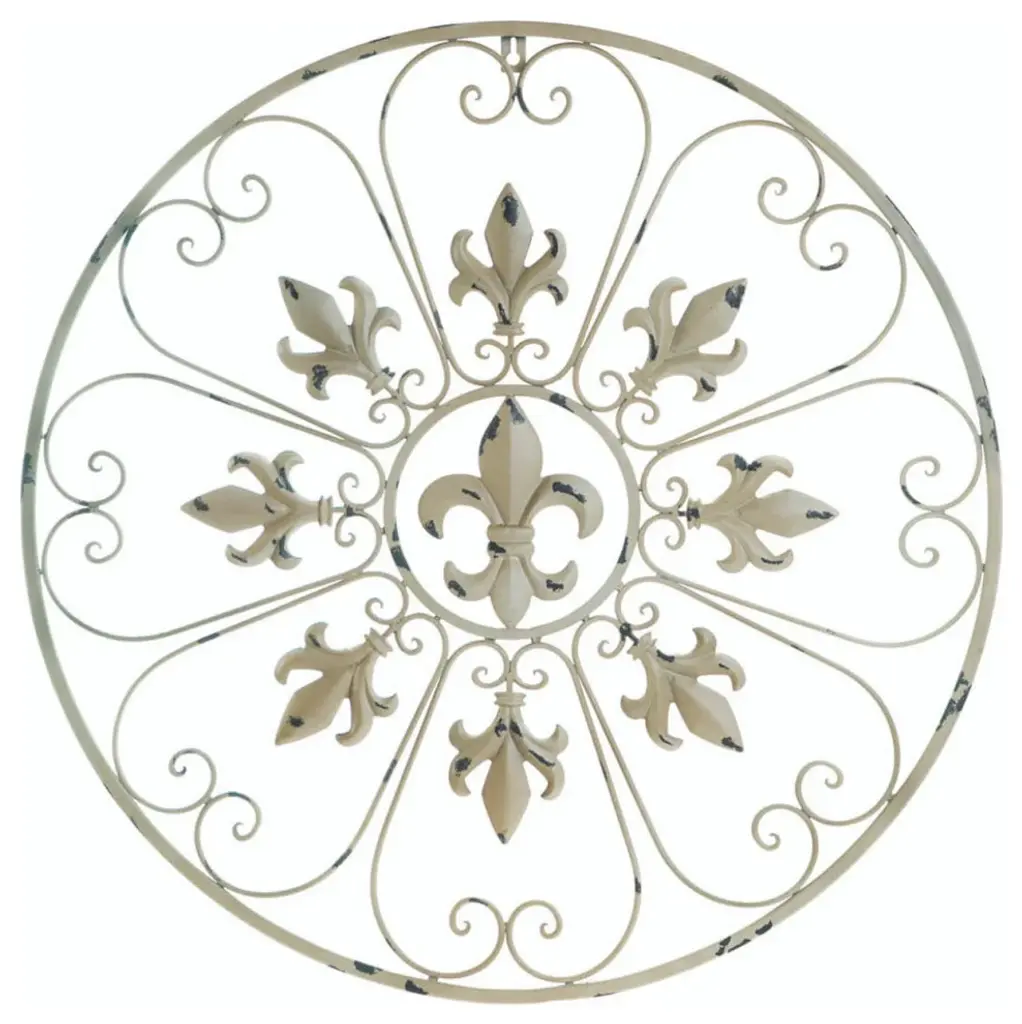 This beautiful wall art is the perfect way to fill empty space above a door or mantle, or to decorate a column or wall. With a scrolling motif inspired by a palace gate, its open design allows the wall to show through. It is a breathtaking and imposing piece, with the classic design and attention to detail that you would expect from a high-end luxury boutique. Hooks on the back for easy hanging. Use indoors or outdoors. Please note that if exposed to the elements it will develop a natural patina over time.• 29.5'''' H x 49.75'''' W x 1'''' deep. Weight: 13.5 lbs.• Hand Finished Iron. Finished in contrasting dark brown and Italian gold.• Monogrammed with 5" Italian Gold iron letter of your choice,or choose a medallion for greater versatility.• Heirloom Quality - Expertly hand crafted and hand finished. Due to the hand crafted nature of this piece, each piece may have subtle differences.