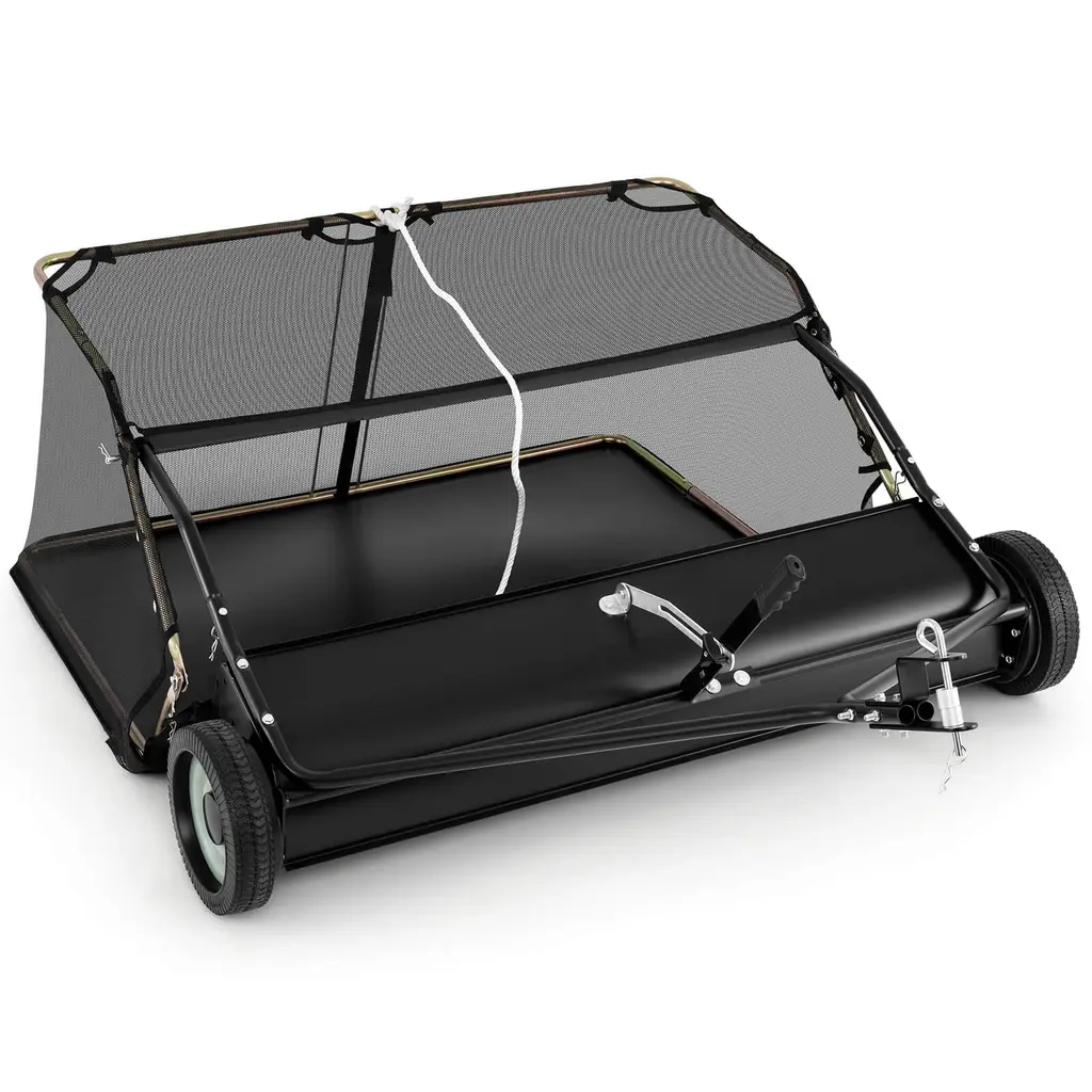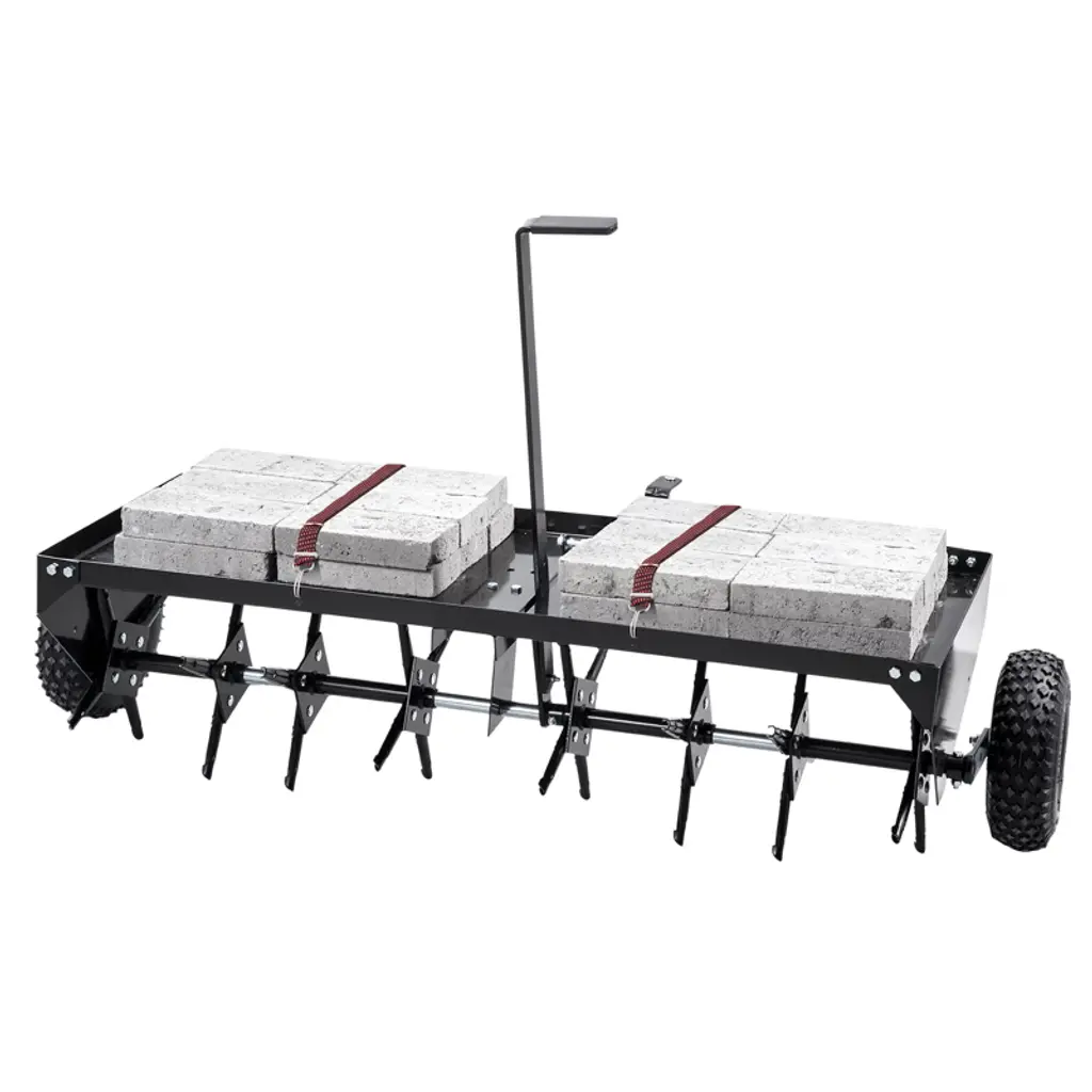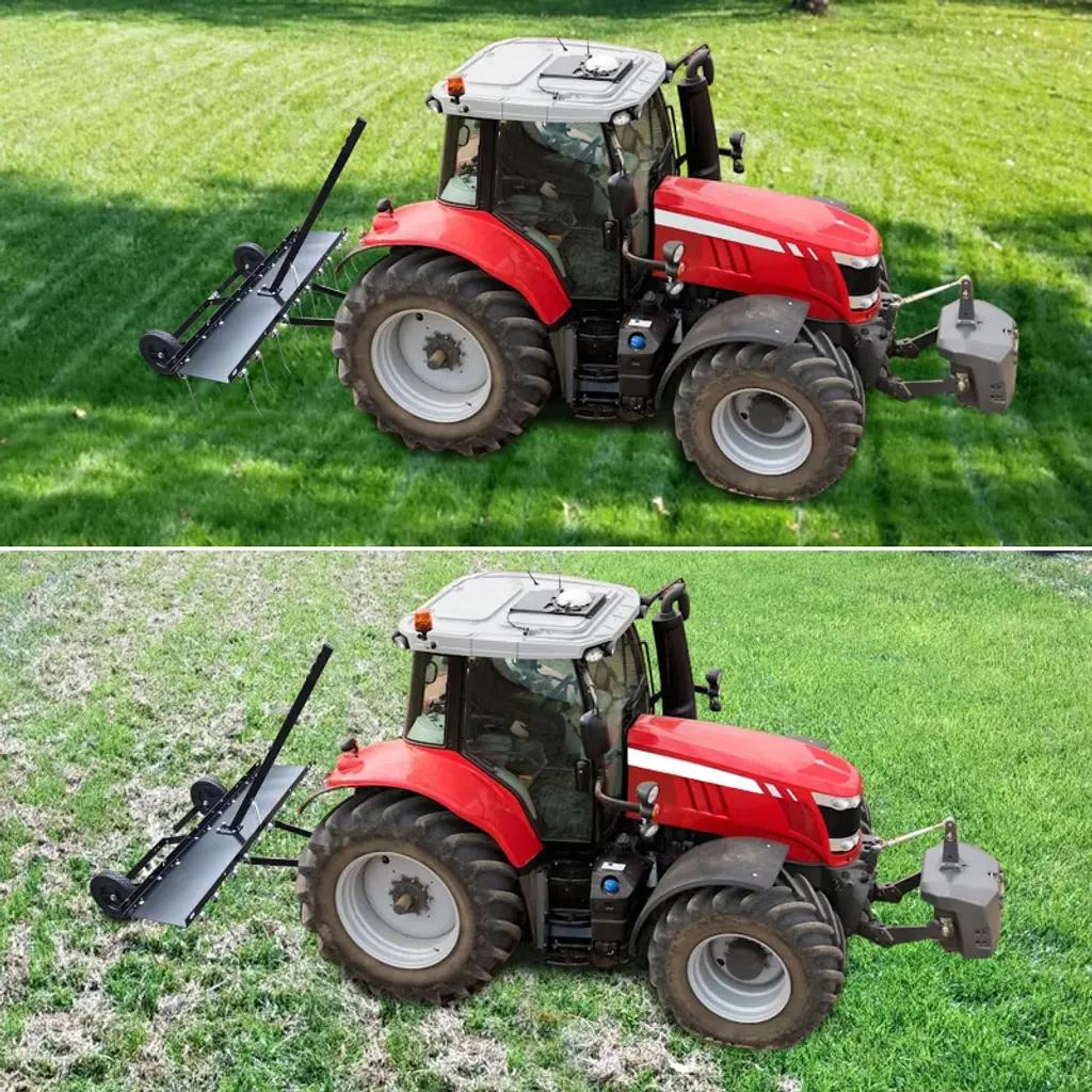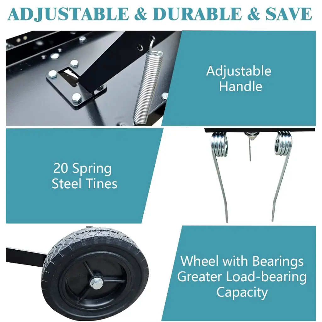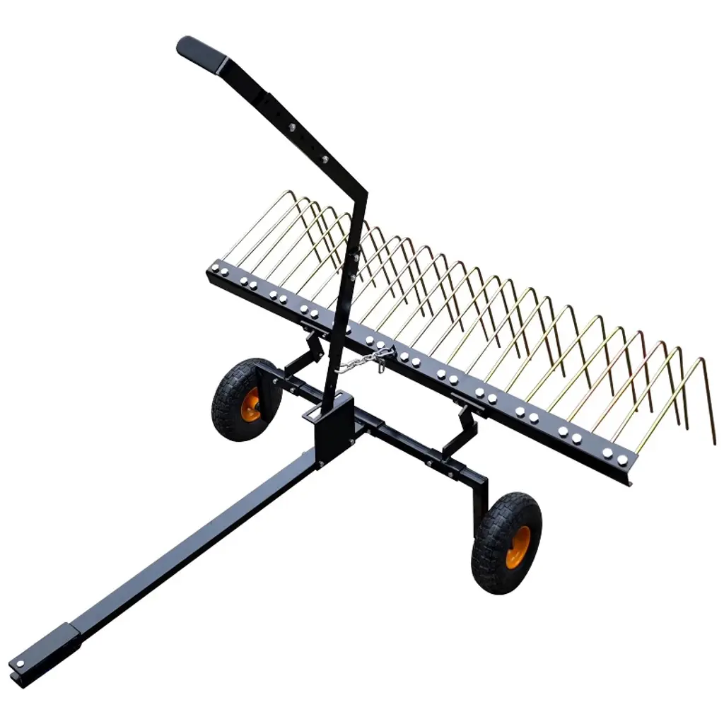 Lawn Dethatcher, Pull Behind Dethatcher for Lawn Tractor, 40-in Steel Tow Behind Thatch Rake for Moss, Leaves and Yard CareKey Features: Efficient Lawn Dethatcher: Equipped with flexible spring steel tines that effectively comb through lawns to pull up thatch, moss, leaves, and debris. Universally compatible with most lawn tractors and agricultural machinery. Adjustable for Various Conditions: Lighter design ideal for wet or sensitive turf where heavy equipment may cause damage. Supports added weight (up to 70 lbs) for deeper dethatching and improved performance. Durable All-Steel Build: Constructed with a solid steel frame and powder-coated finish for rust resistance and extended durability. Effectively removes pine needles and thatch with minimal effort. Convenient Tow-Behind Operation: Designed with a lift handle for easy height adjustment from the operator¡¯s seat. The 40-inch width offers balanced maneuverability and efficient lawn coverage. Easy to Attach and Use: Features a standard 1.18" hitch pin connection for quick installation with riding mowers or ATVs. Assembly is straightforward, and the 8-inch solid rubber tires provide smooth towing and stability. Specifications: Product Dimensions: 40"W x 34.1"H Brand: TROPOW Material: Steel, Pine Hitch Pin Size: 1.18 inches Tire Type: 8-inch solid rubber Special Feature: Adjustable height, weightable design (up to 70 lbs)
