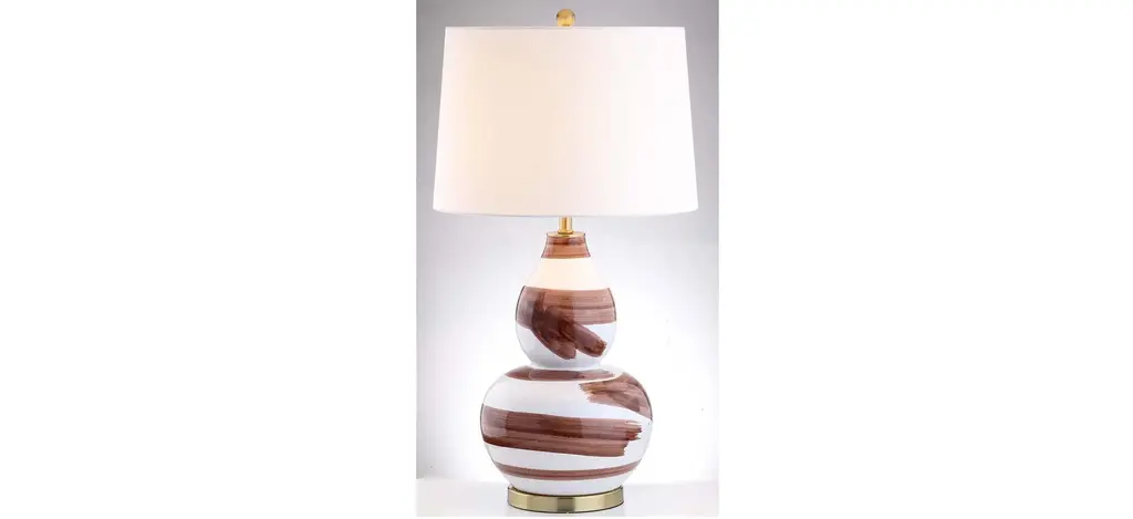 Inspired by contemporary artisans, this striking Lawson Table Lamp is a modern work of art. Finely crafted, its smooth, curved body features a bold brown and white pattern that blends into any living room. Used as a focal point or in pairs, its shade is timeless.
