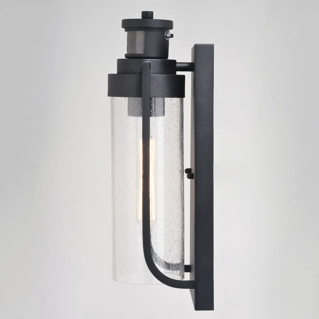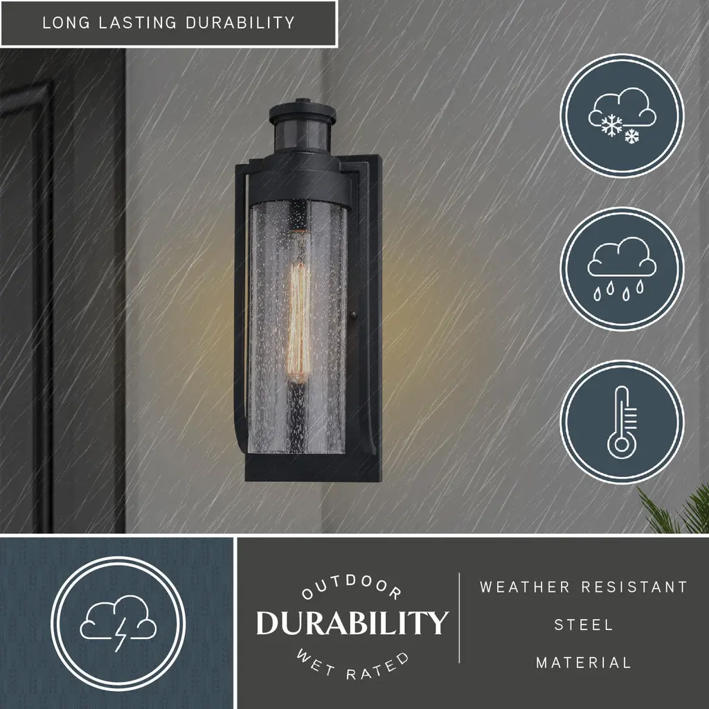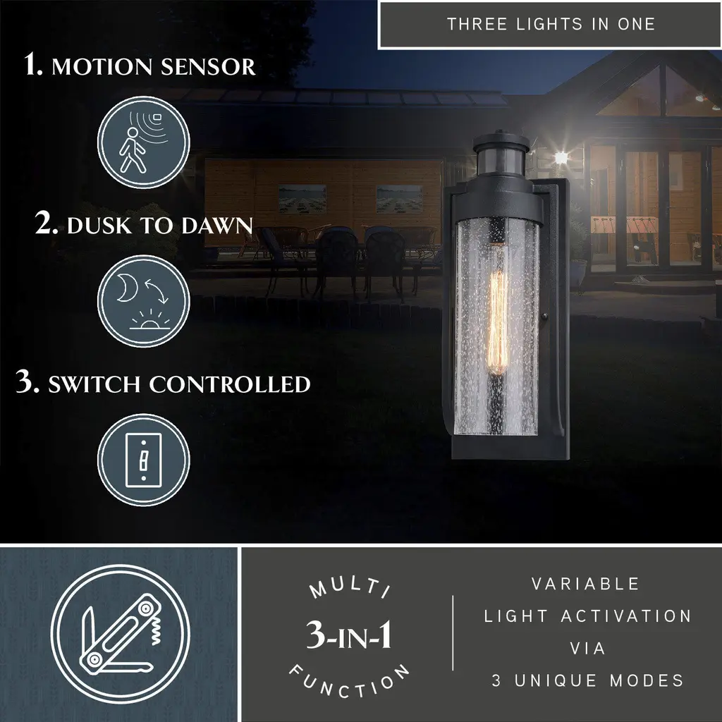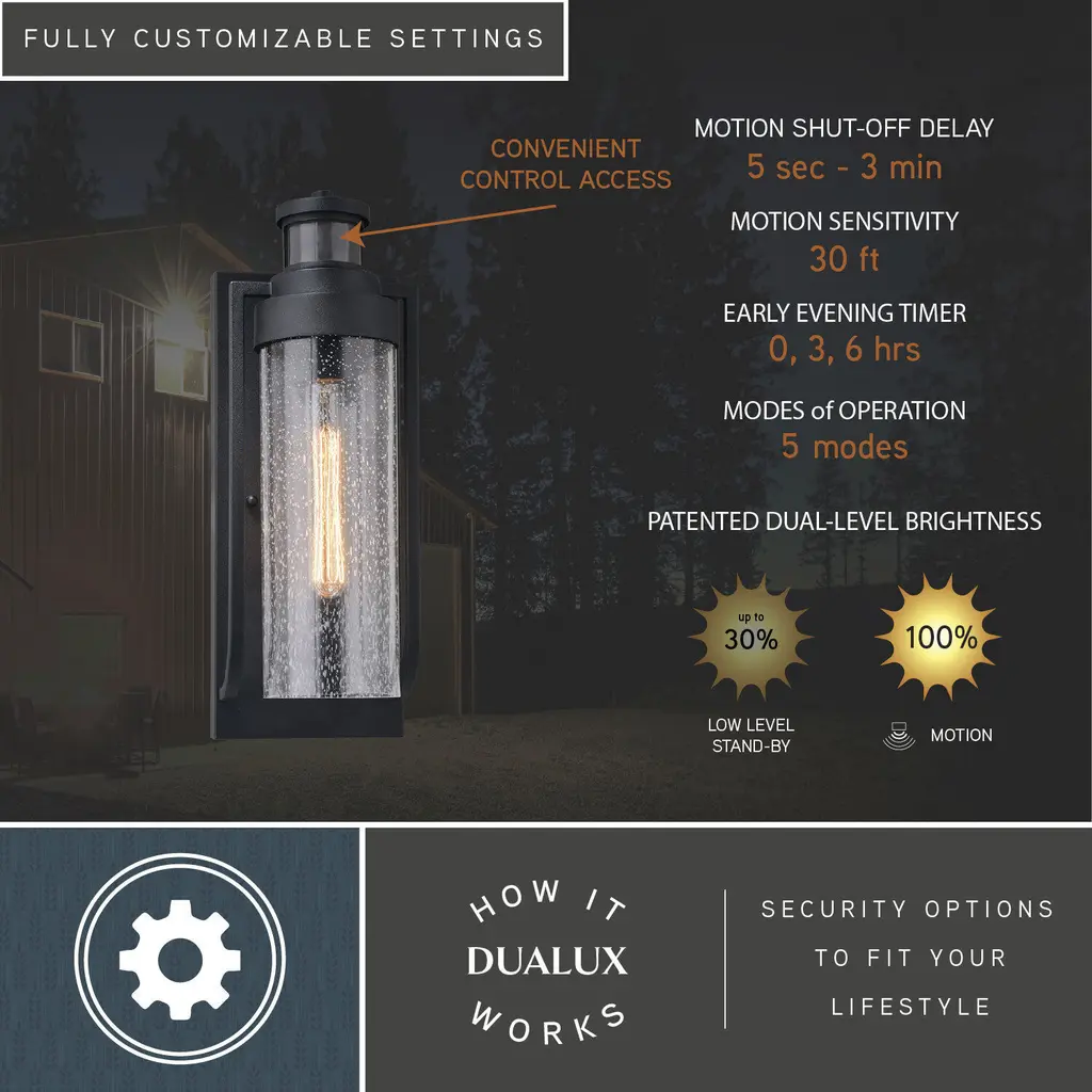 Contemporary in styling, the Lawton collection combines a durable aluminum frame in a textured black finish with a clear seeded glass cylinder. Dualux outdoor security lighting is designed to fit your lifestyle and enhance the beauty, safety, and usability of your home's exterior areas. Enjoy the comfort and convenience of dusk-to-dawn automatic dimming to provide soft, ambient illumination until dawn. Rest assured knowing that whenever motion is detected, on-demand bright illumination will be triggered to keep your property safe and secure. Standard on/off motion detection or full brightness dusk-to-dawn modes are also available to try using the EZSET controls. This fixture works with most dimmable LED bulb models. You get convenience, security, and efficiency with Dualux outdoor light fixtures.