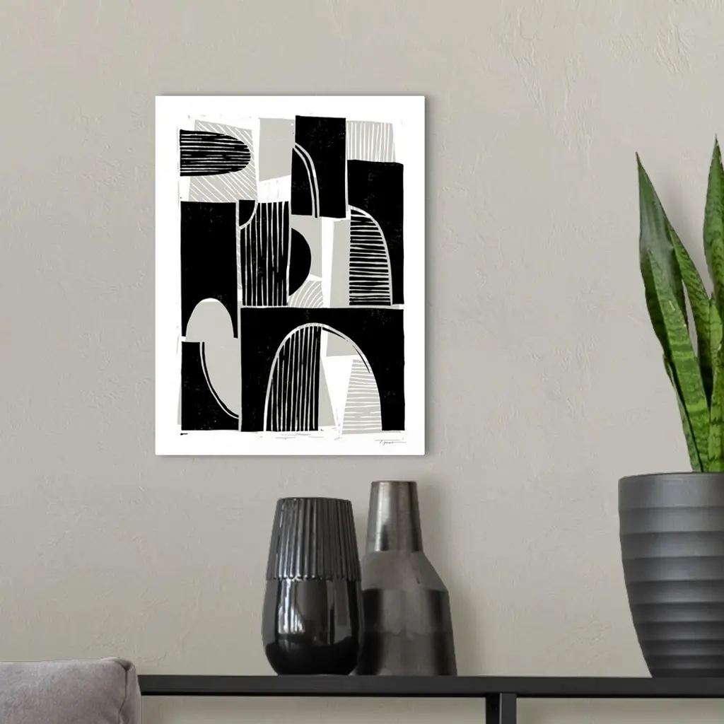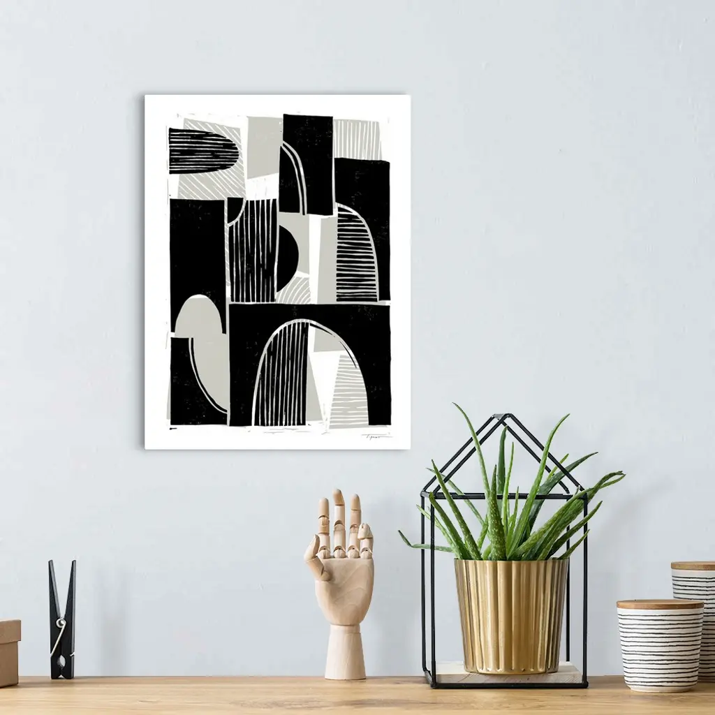 Modern abstract block print with taupe background shapes and black foreground shapes.