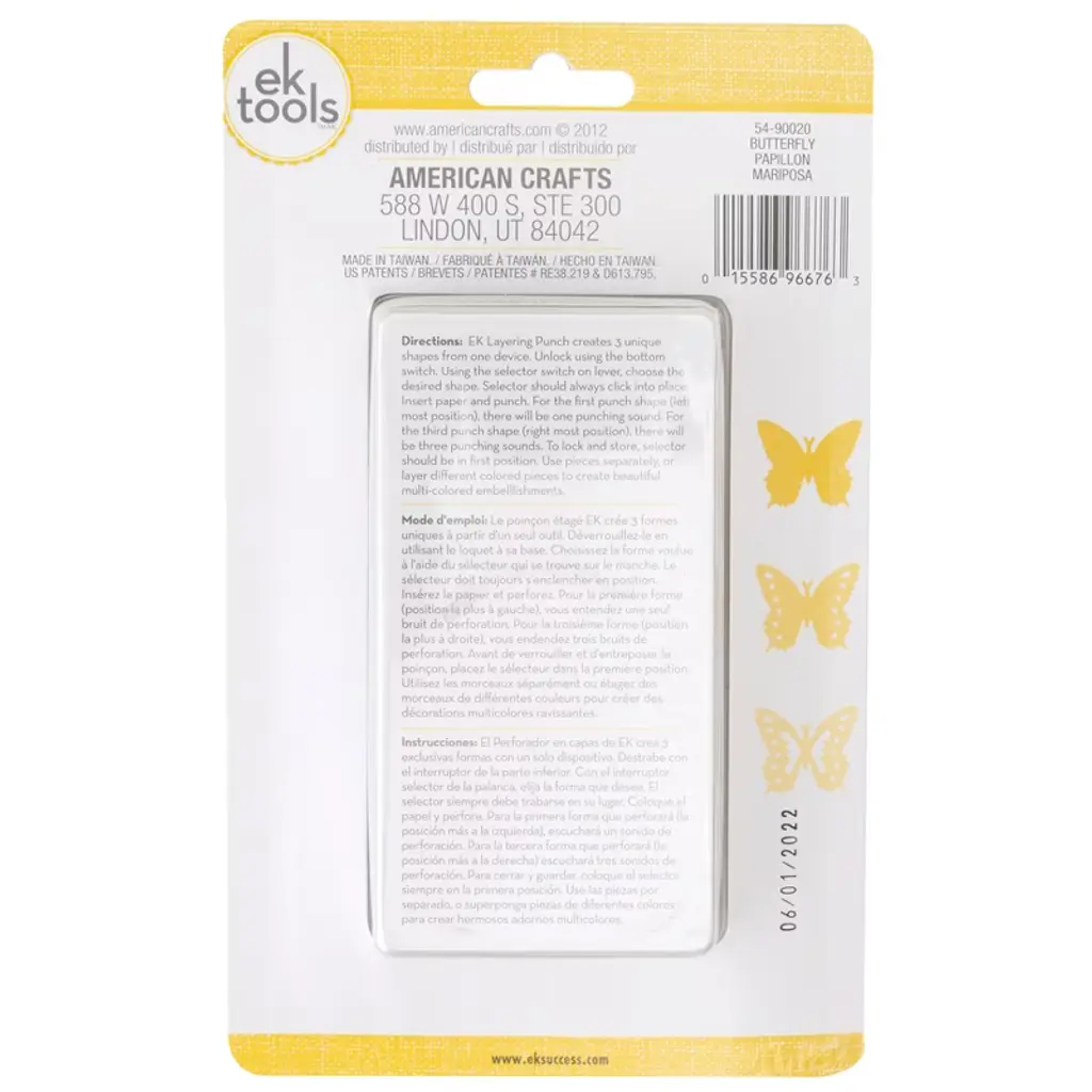 Use this high-quality craft punch to create unique punched designs and make works of art on greeting cards, scrapbook pages, mixed media, altered art and more! This punch creates three unique shapes -use the selector switch to choose your design and punch. This package contains one Layering Punch: Butterfly. Die-cut measures approximately 1x1.25 inches.